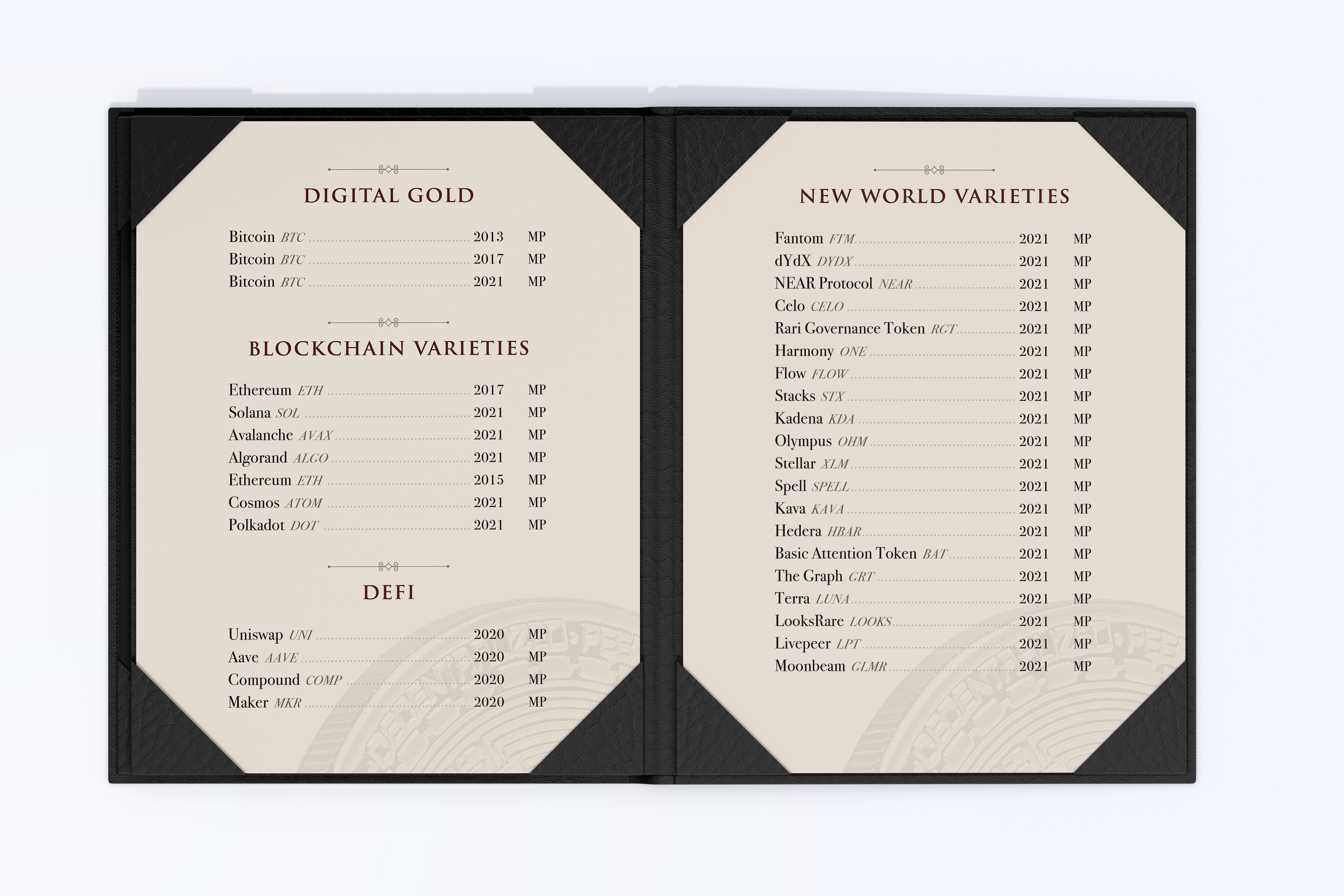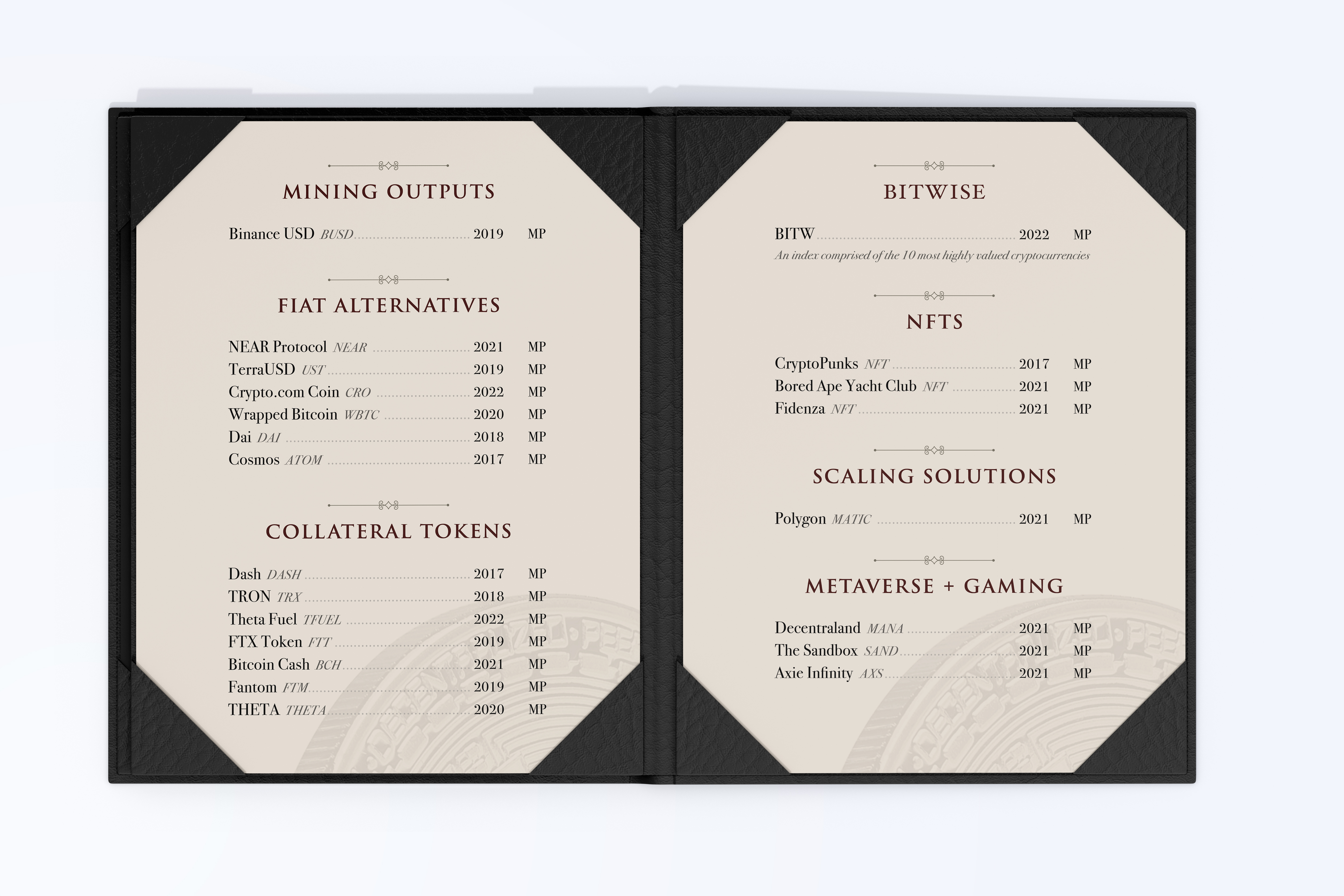 I collaborated with a fellow designer, Michelle Jacobs, to come up with a crypto menu that reads like a wine menu.