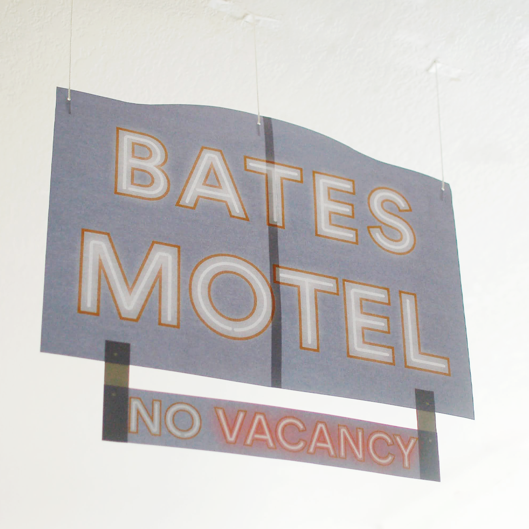 The neon “office” sign replica that sits above Norman Bates’s office door in the film. I created the type myself using strokes with rounded caps and added a white glow to the type.