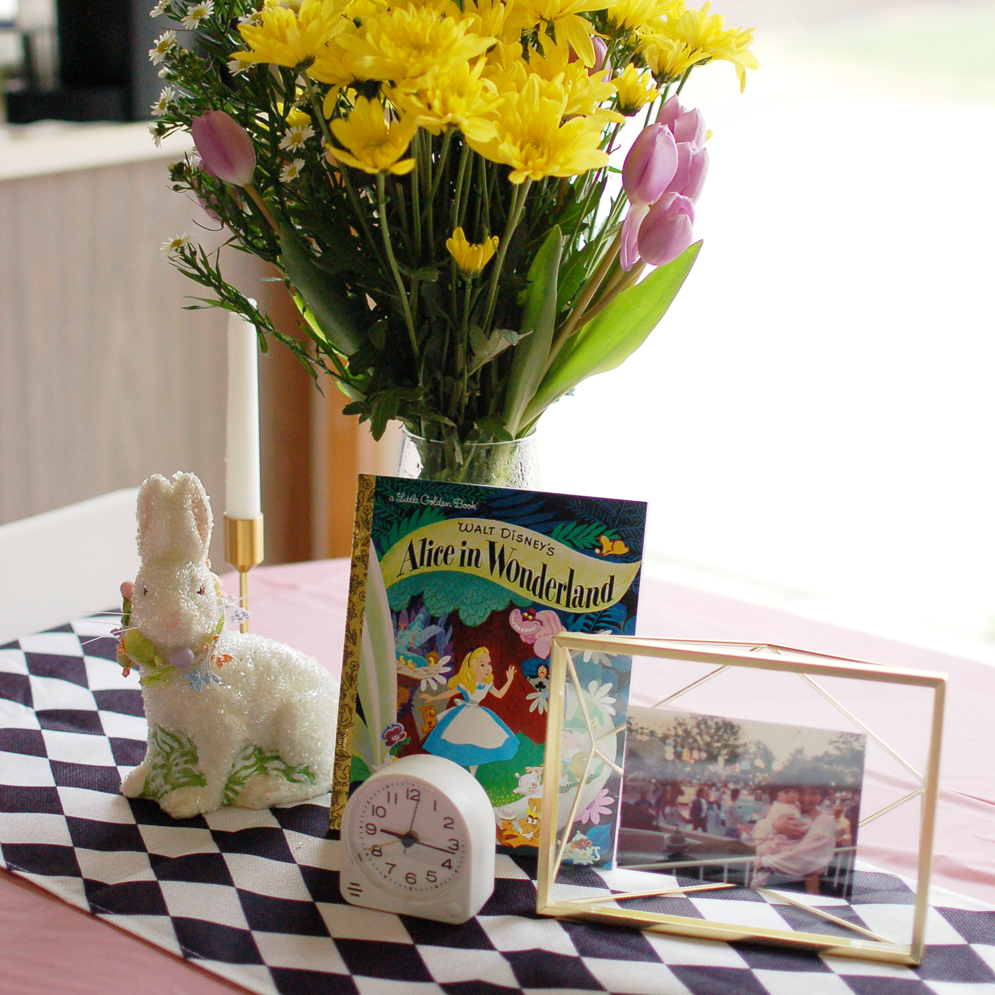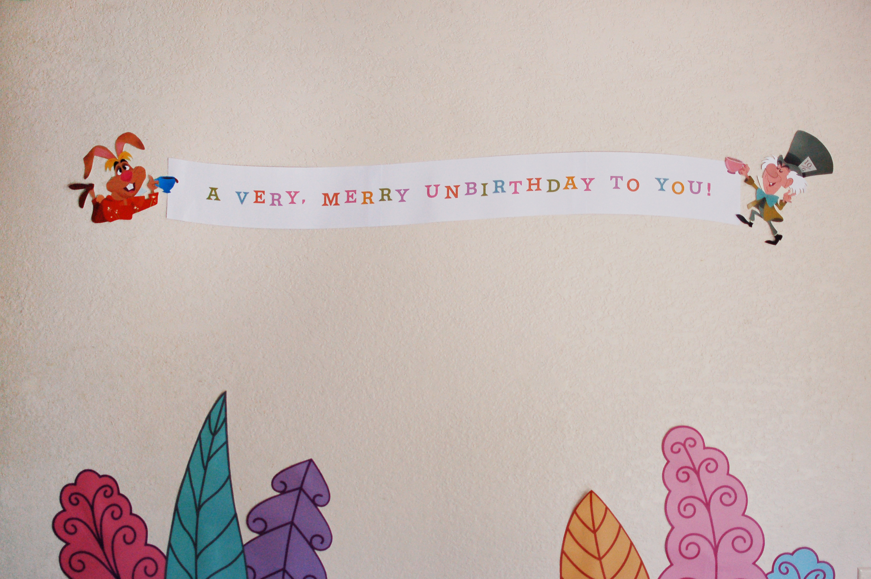 I designed the “Merry Unbirthday” banner, as well as recreated the leaves you’d find outside the Alice in Wonderland ride in Disneyland.