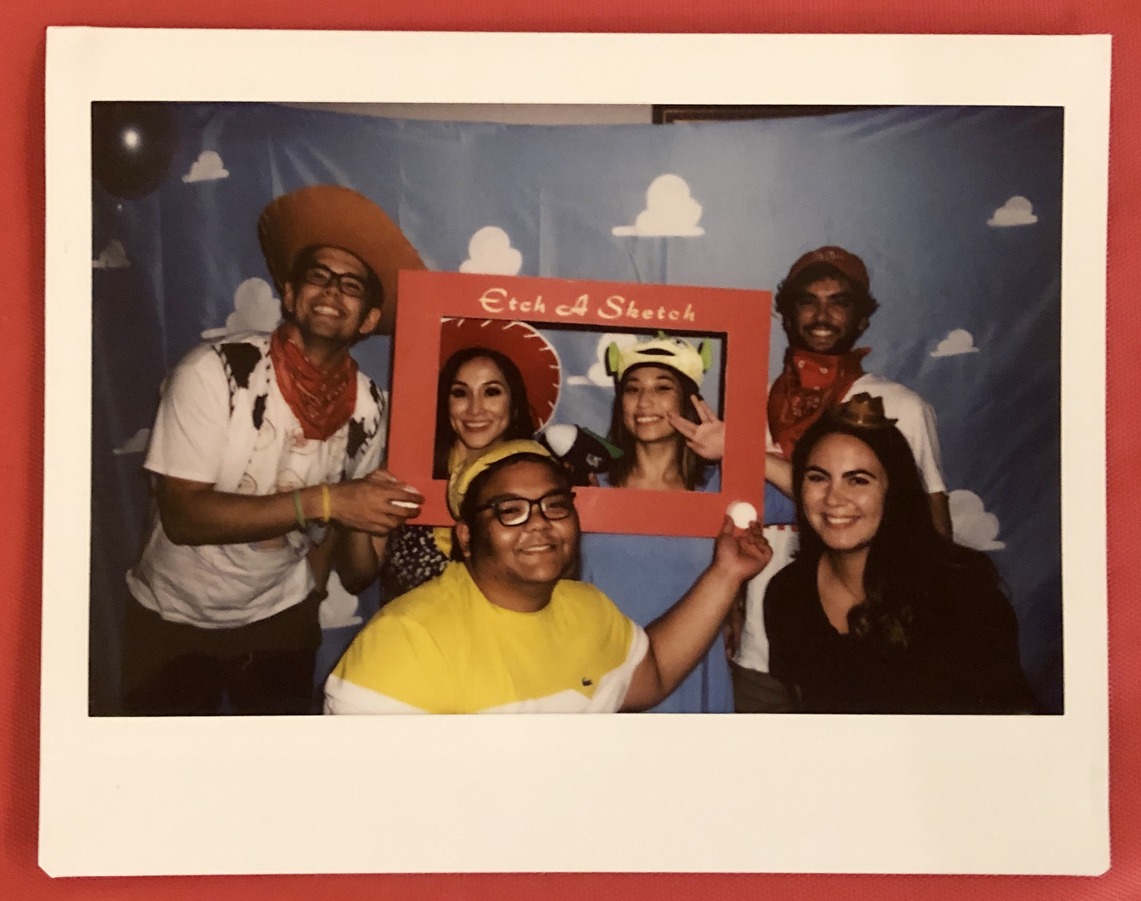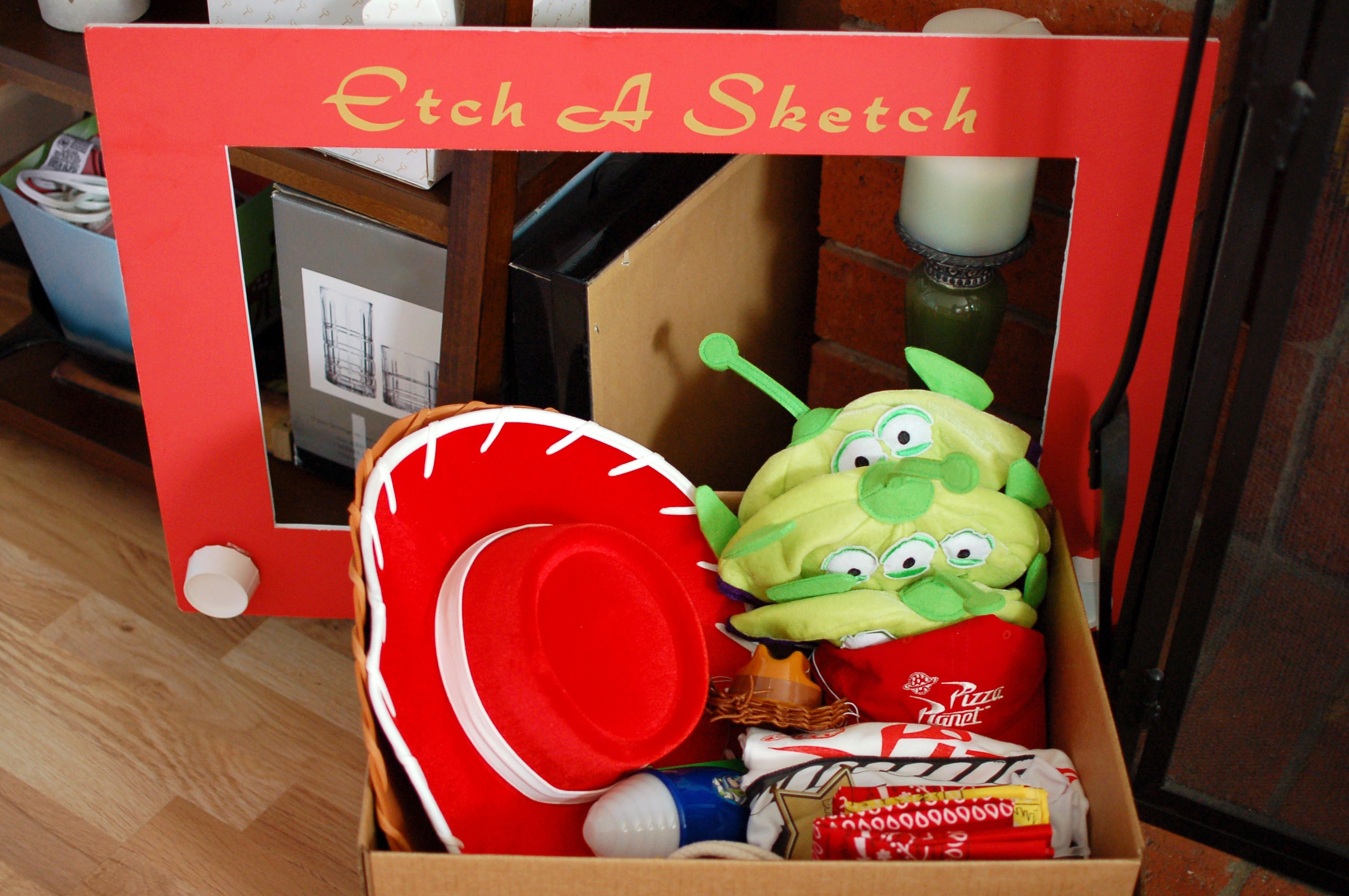 I created the “Etch A Sketch” frame from red foam board, the bottoms of white paper cups, and cut out letters by hand. I bought photoshoot/costume props that are all from Toy Story.
