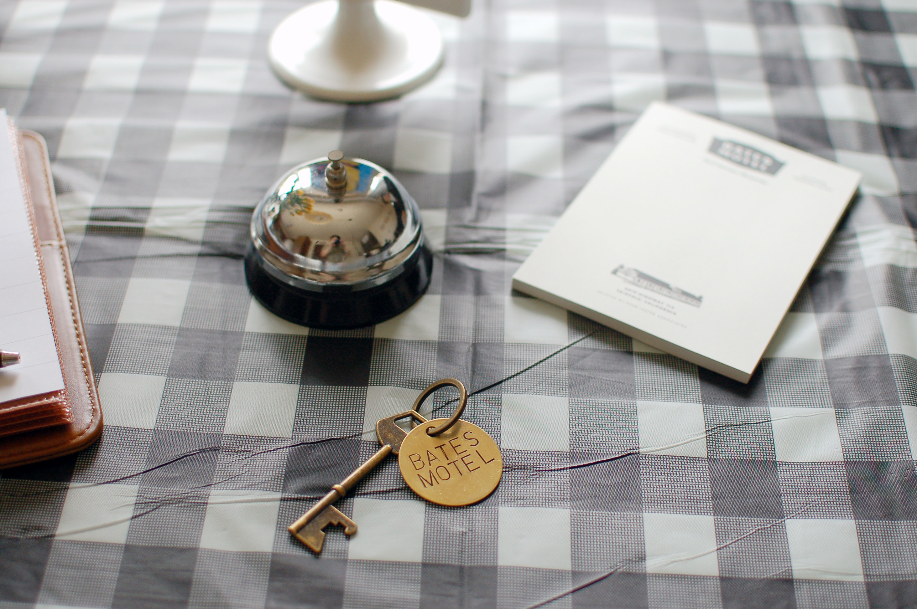 It’s not a motel without a service bell, a real key, and a complimentary notepad. The key and notepad came from this great site called Herb Lester Associates that sells a collection of fictional notepads.