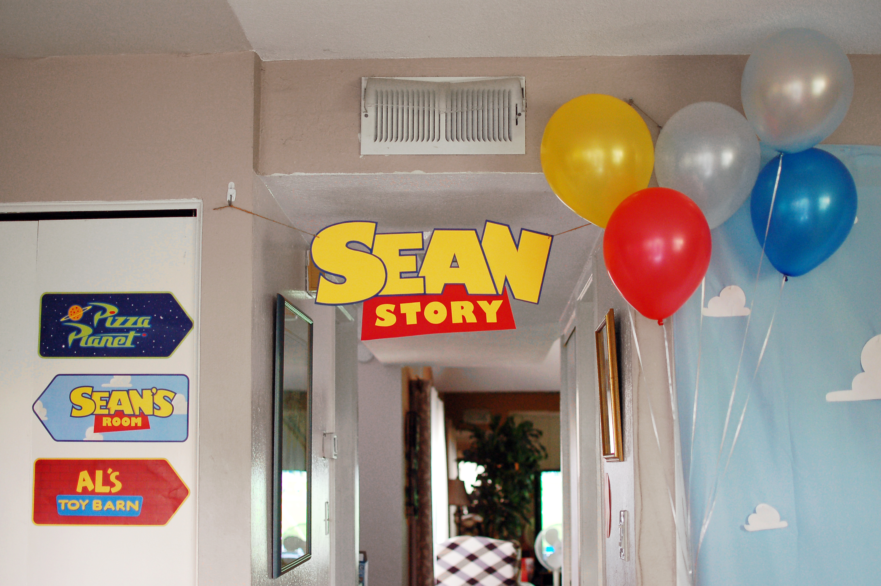 For the entryway, I cut out the “Sean Story” banner by hand using different colored sheets of paper.
