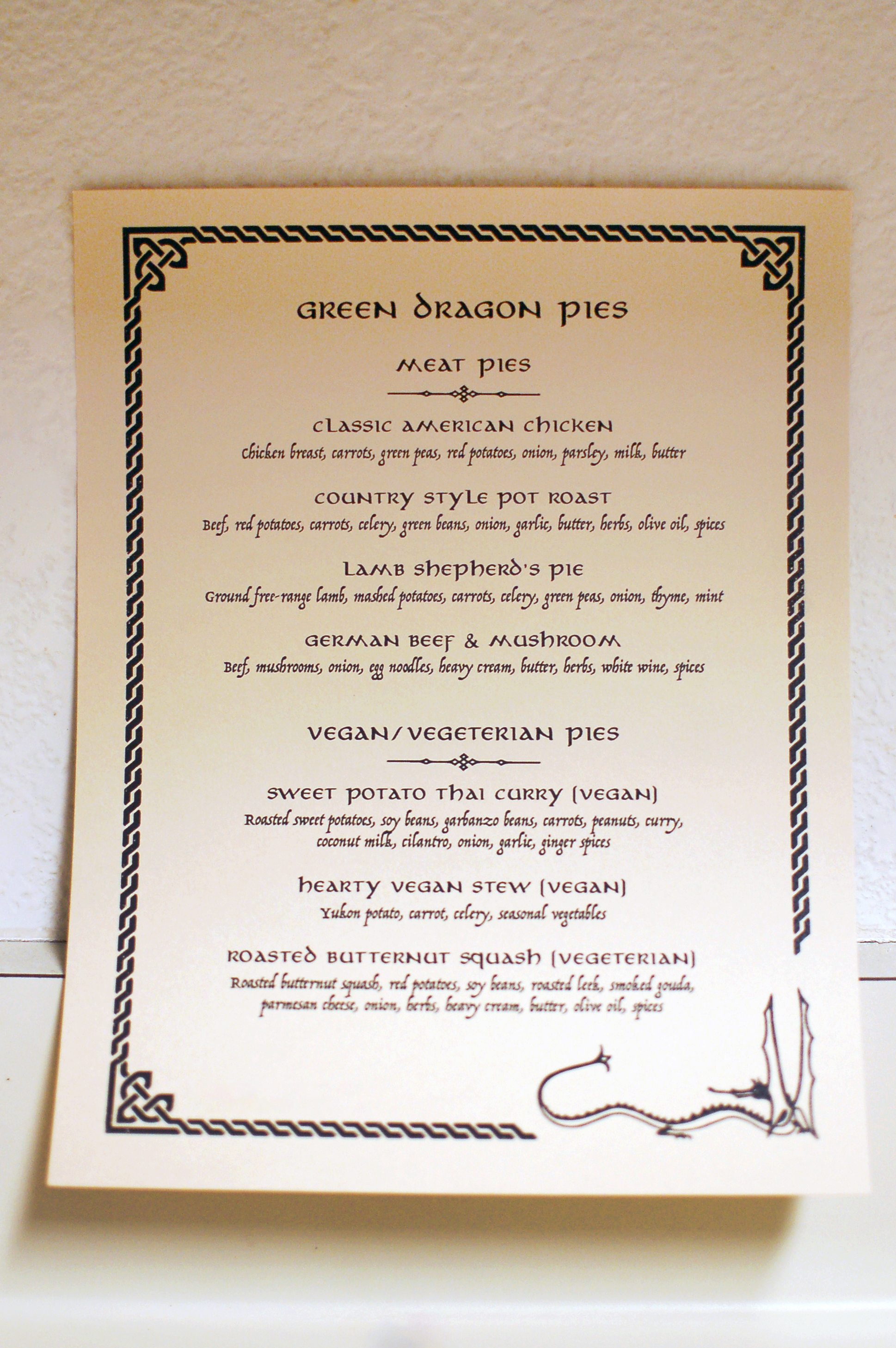 To keep it true to The Green Dragon, I served Meat Pies for dinner (as well as Vegan/Veggie Pies to cover all my bases) and created a Hobbit-style menu that listed all of our pie options.
