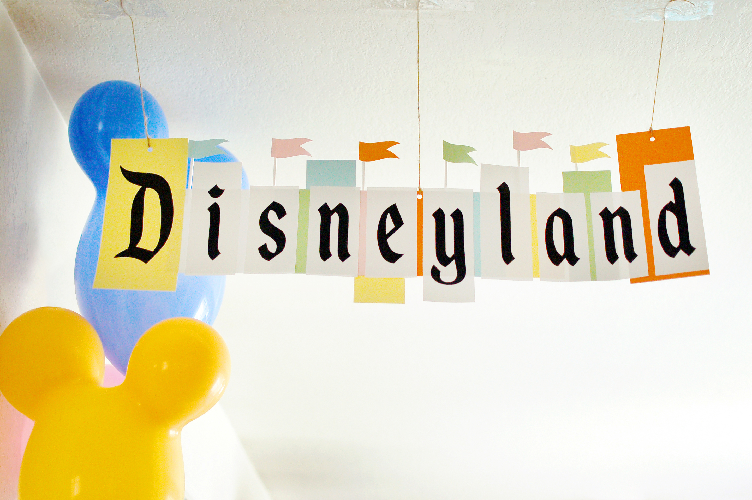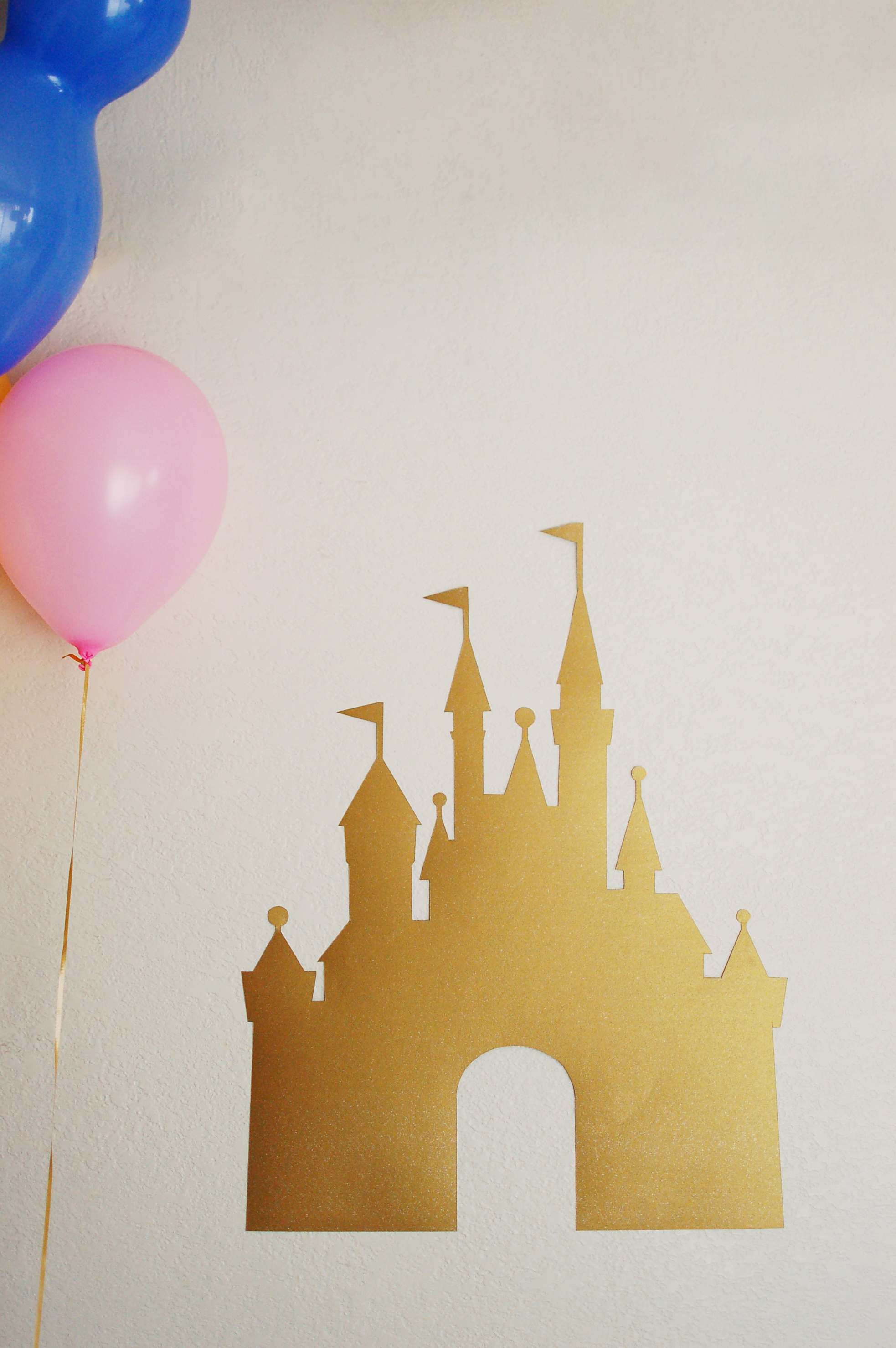 The heart of the park—the castle itself! I cut out this Disneyland castle by hand using gold metallic poster paper. It doesn't quite measure up to the real thing, but stood at 22.5 inches in height as the main decoration piece. Of course, you can't forget the Mickey-shaped balloons.