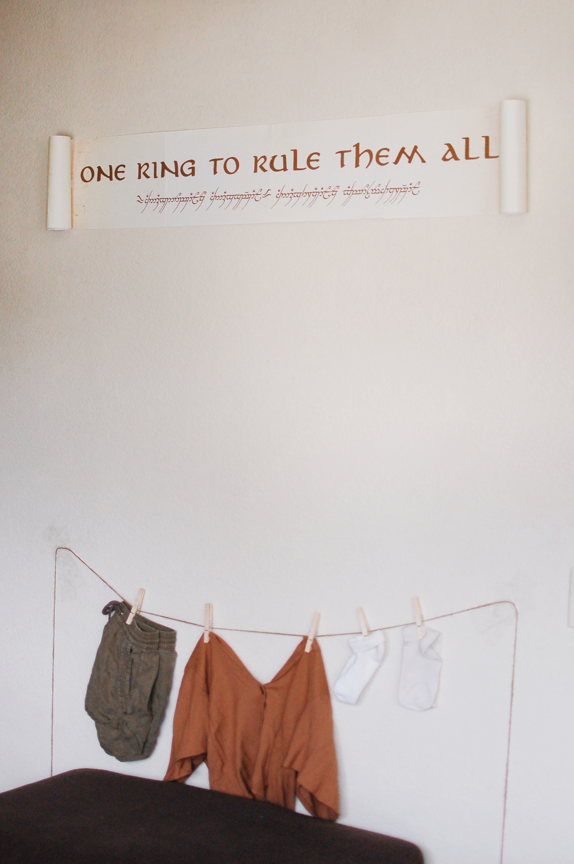 Under the banner, I added a clothes line with Hobbit-like clothes, to transport guests to The Shire.
