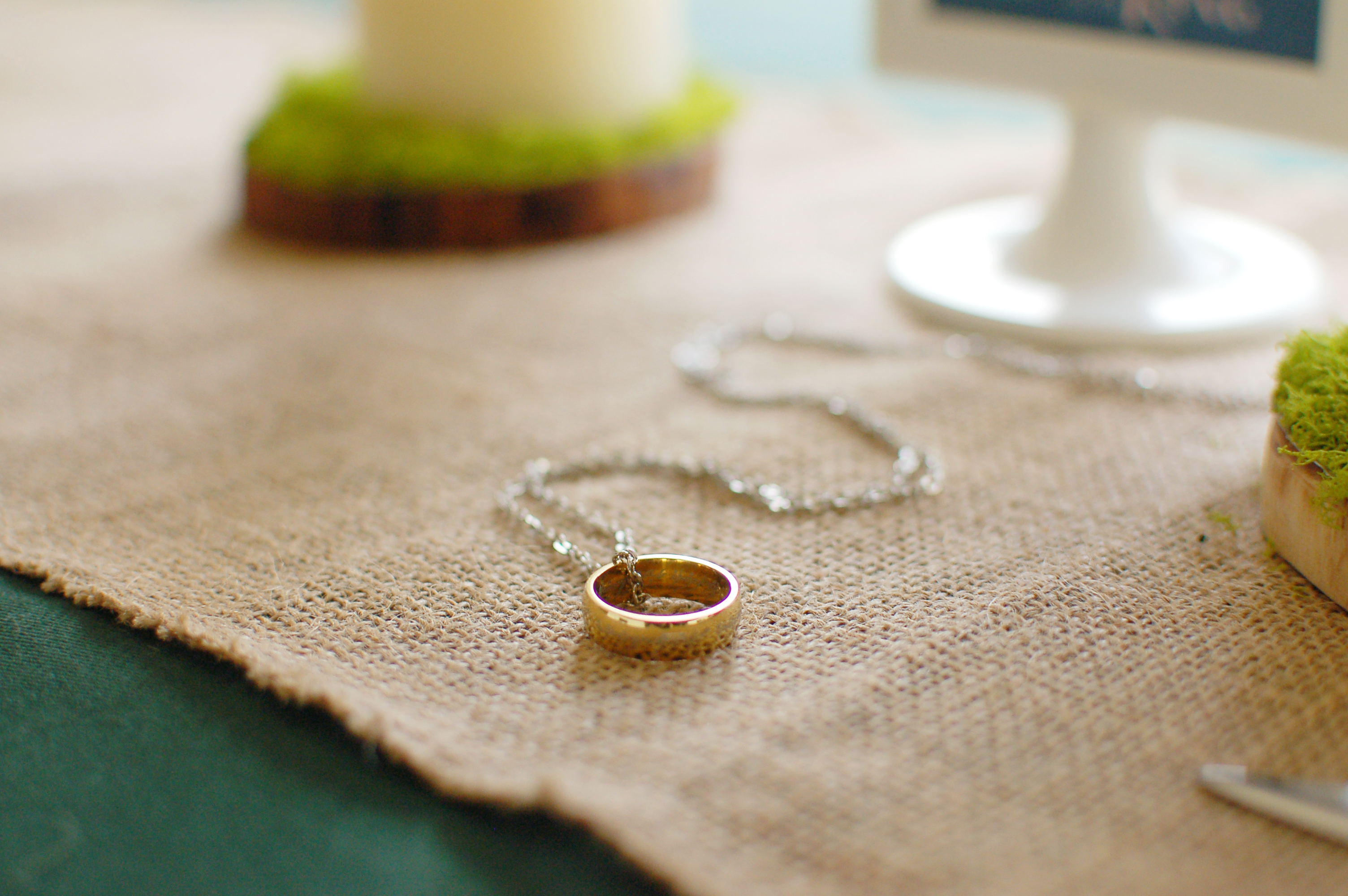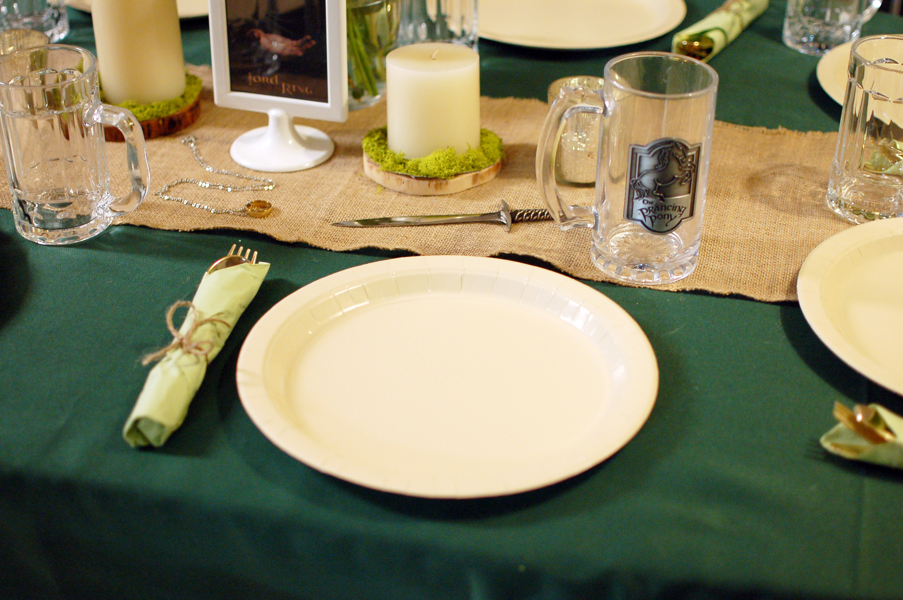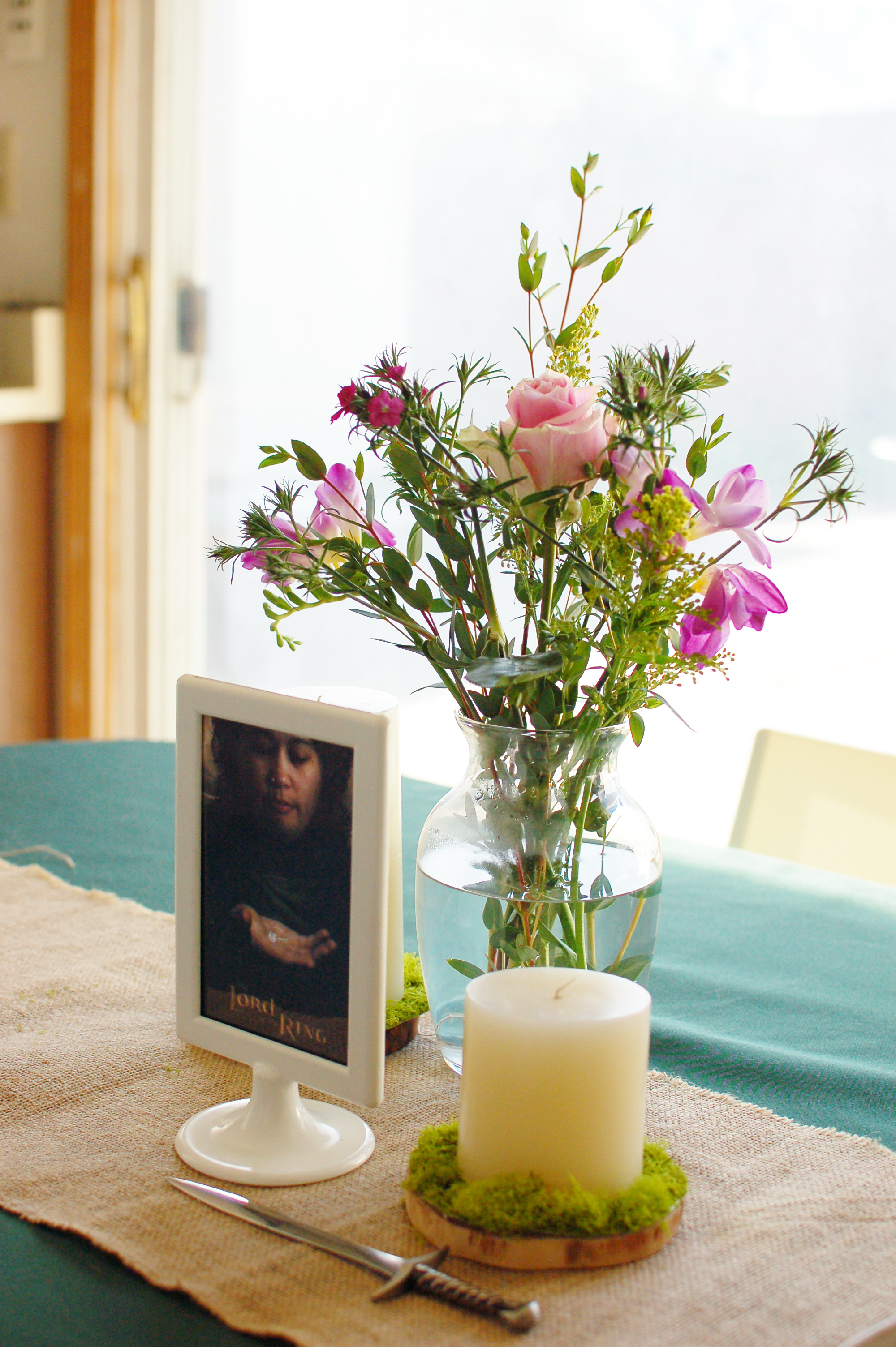 For the table, I photoshopped my sister and her engagement ring into The Fellowship of the Ring poster. I grabbed some flowers from the store that looked like they were plucked from The Shire, added some moss on top of our candle coasters, and threw in our “Sting” mail opener.