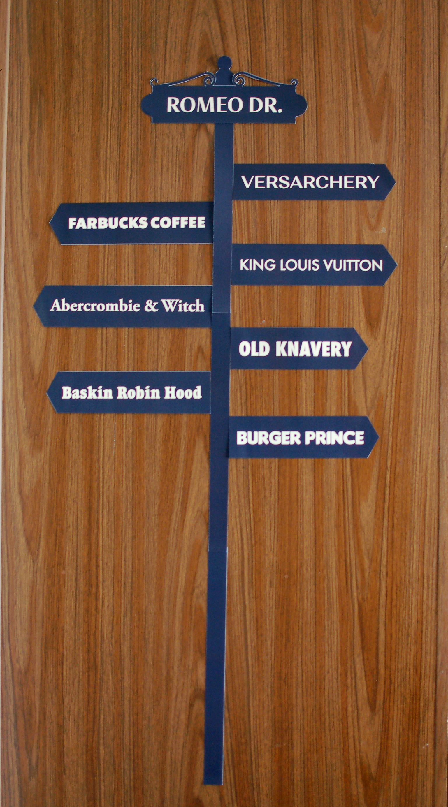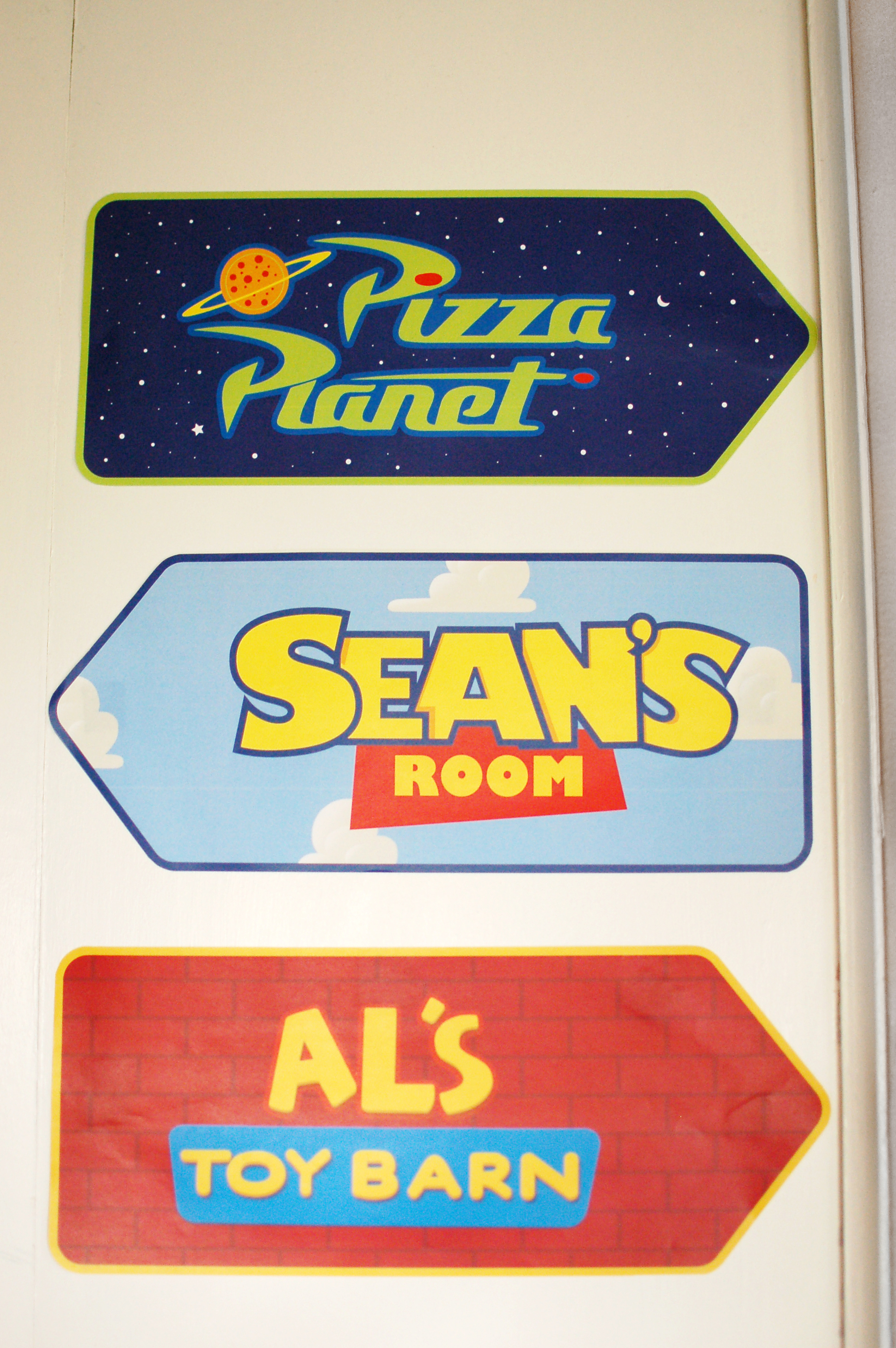 Directional signs with locations from the movie. For the Pizza Planet and Al’s Toy Barn logos, I used assets I found online. The “Sean’s Room” sign I created from scratch in Illustrator.