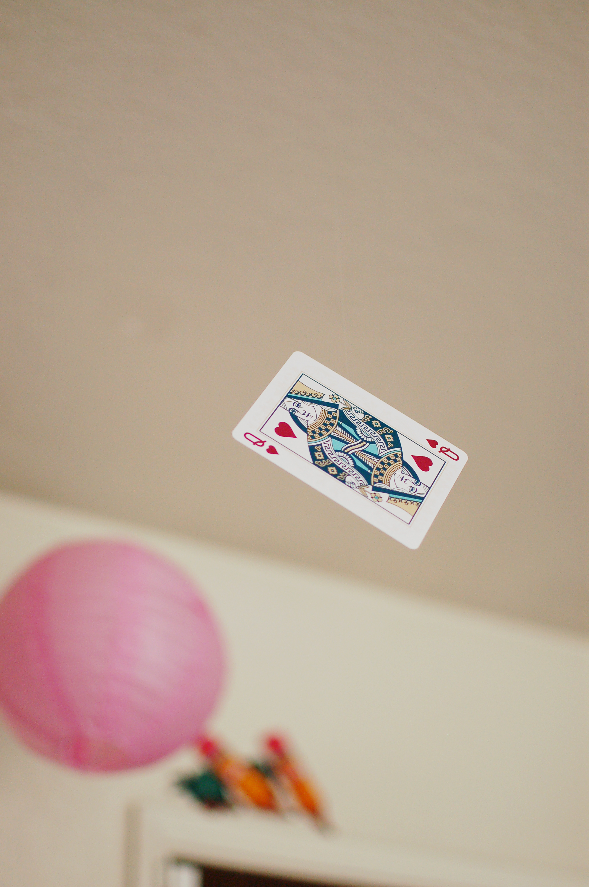 I had characters and playing cards hanging along side the colorful lanterns, the Queen of Hearts card, of course.