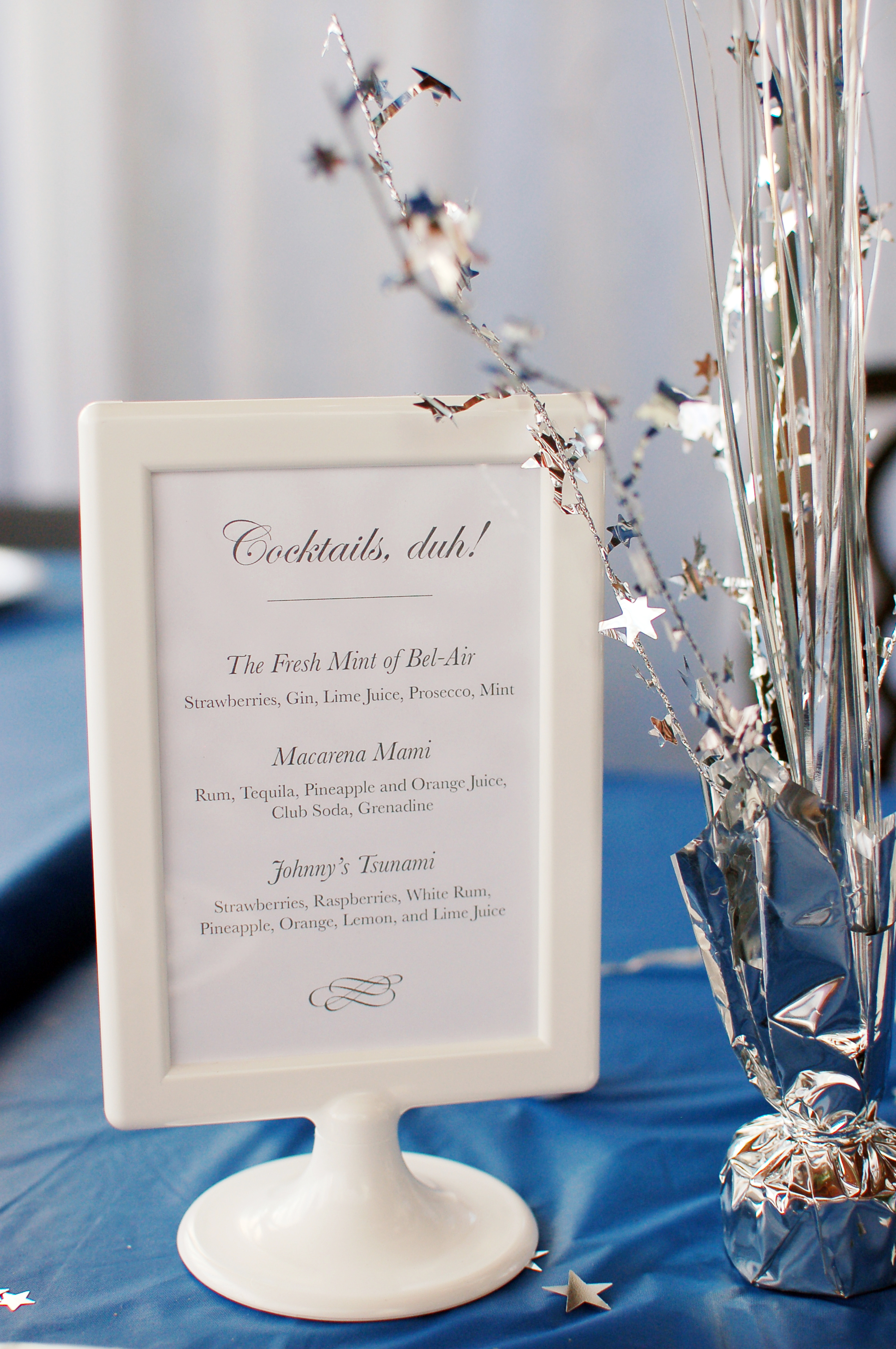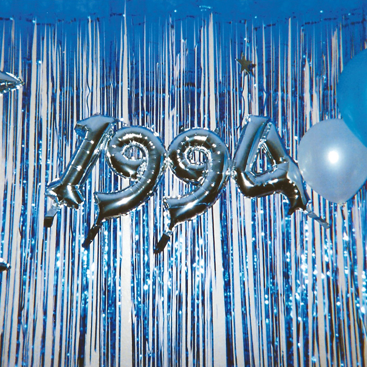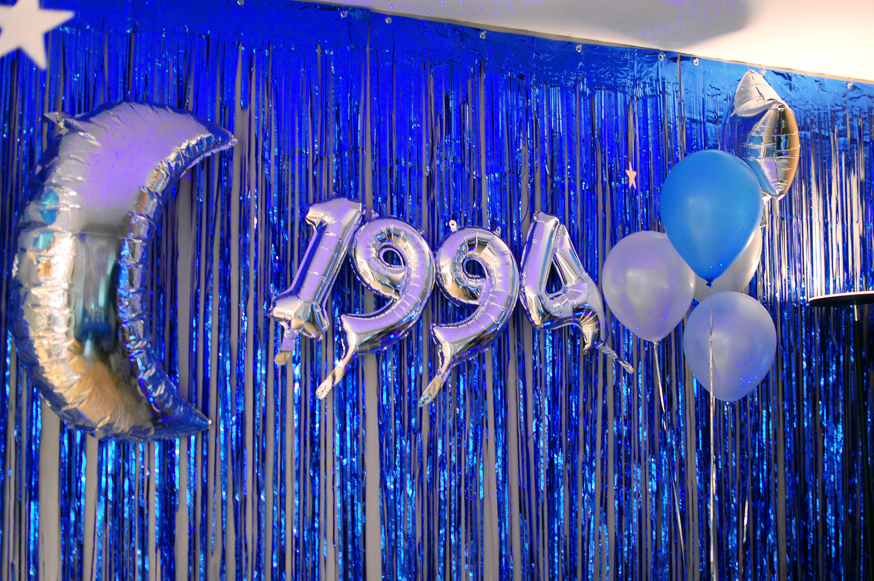 The main wall. I decided “1994” was the year our prom was set in, since it’s my birth year. I stuck with a metallic blue and silver color theme for all decorations. For proms, metallic fringe and balloons are essential.