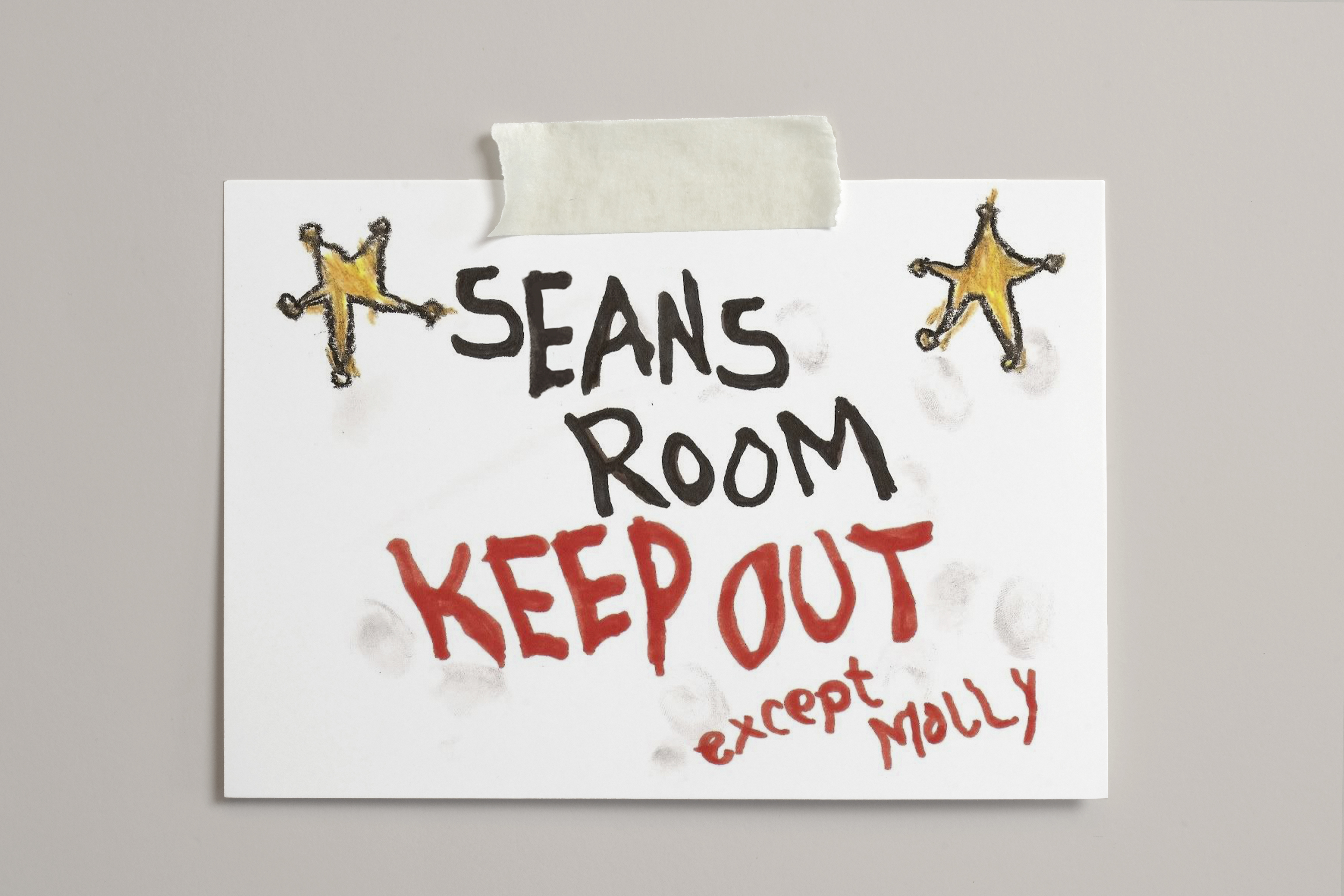 I took the “Andy’s Room” sign and swapped out “Andy’s” with “Sean’s”. I created the new letters using Photoshop.