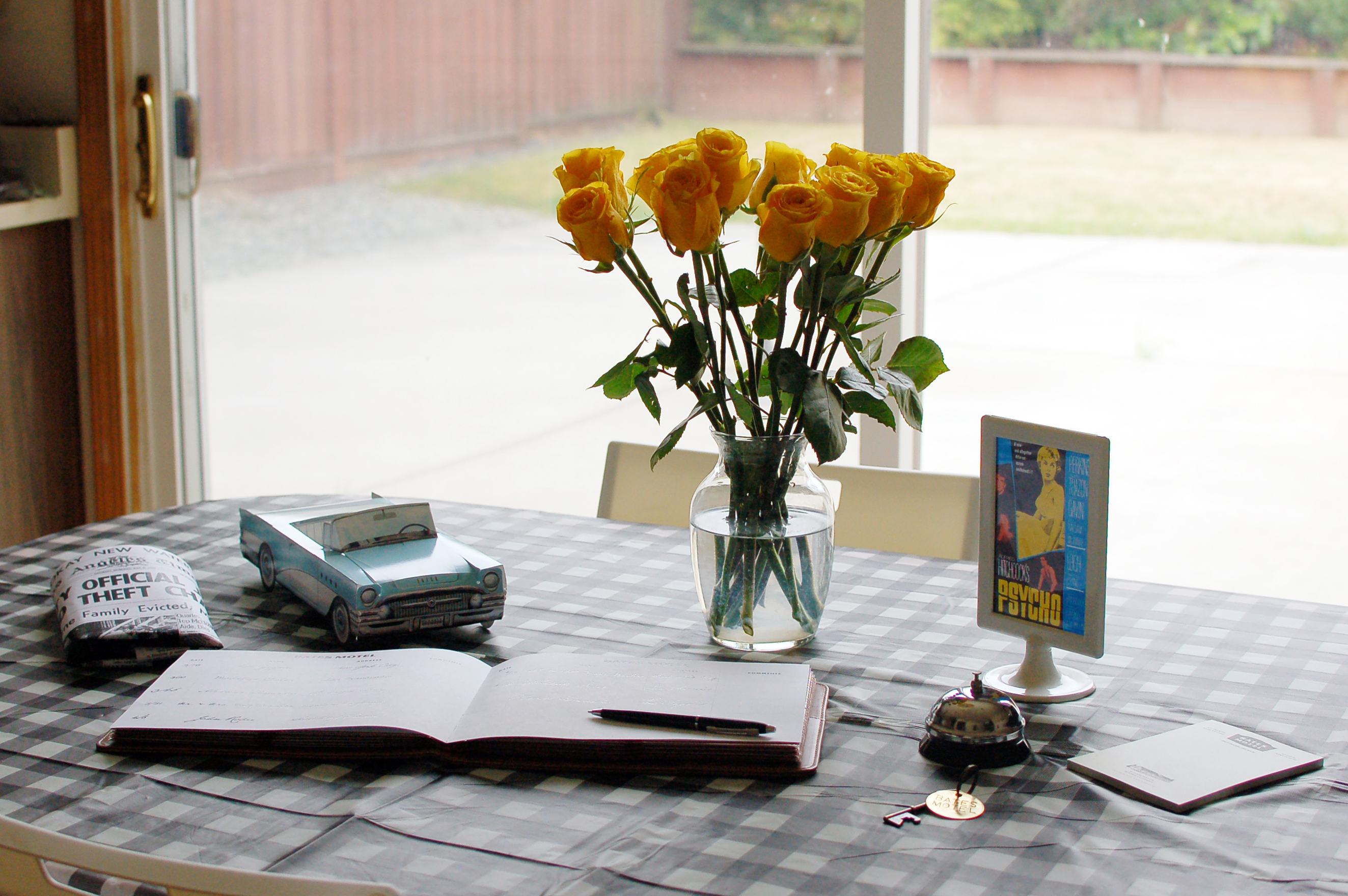 The table setting at Bates Motel is complete with yellow flowers to match the poster, as well as a black and white gingham table cover, similar to one found in Norman’s mothers home, and more. Let’s get into the details…