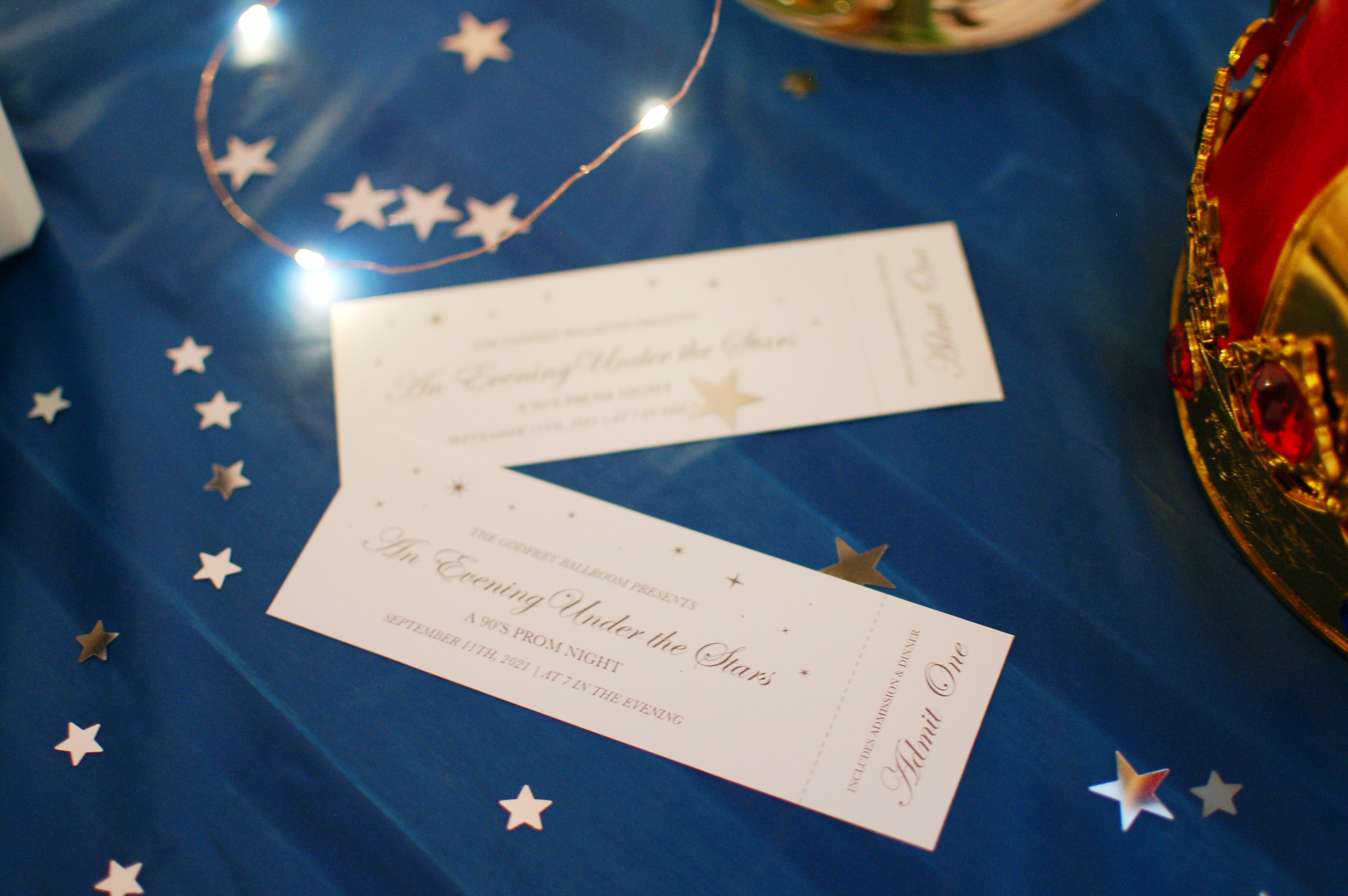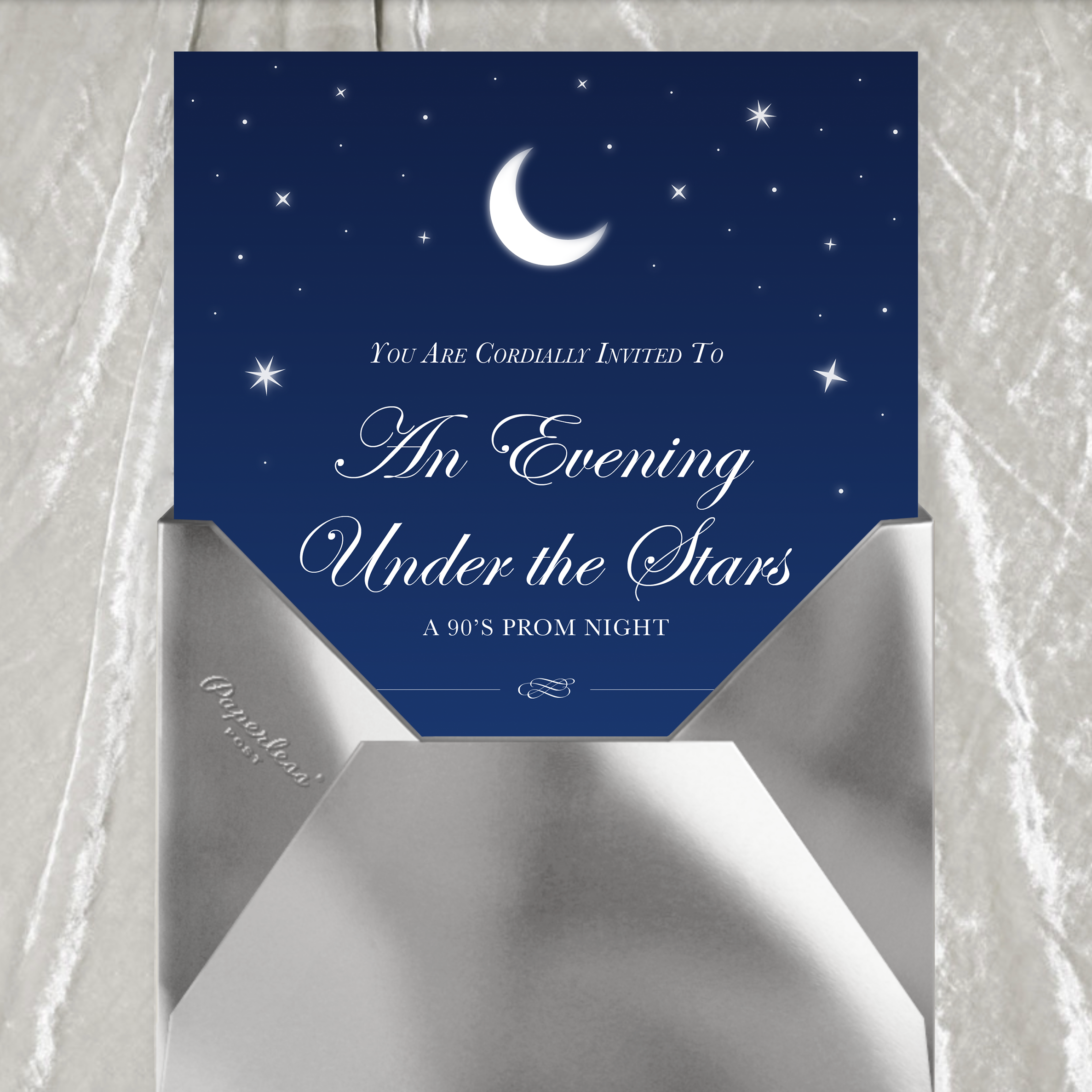 The Paperless Post invitation. It wouldn’t be a 90's prom without a cheesy theme name. I used a classic system font, Edwardian Script ITC as the primary font for the party branding and Baskerville as the secondary font.