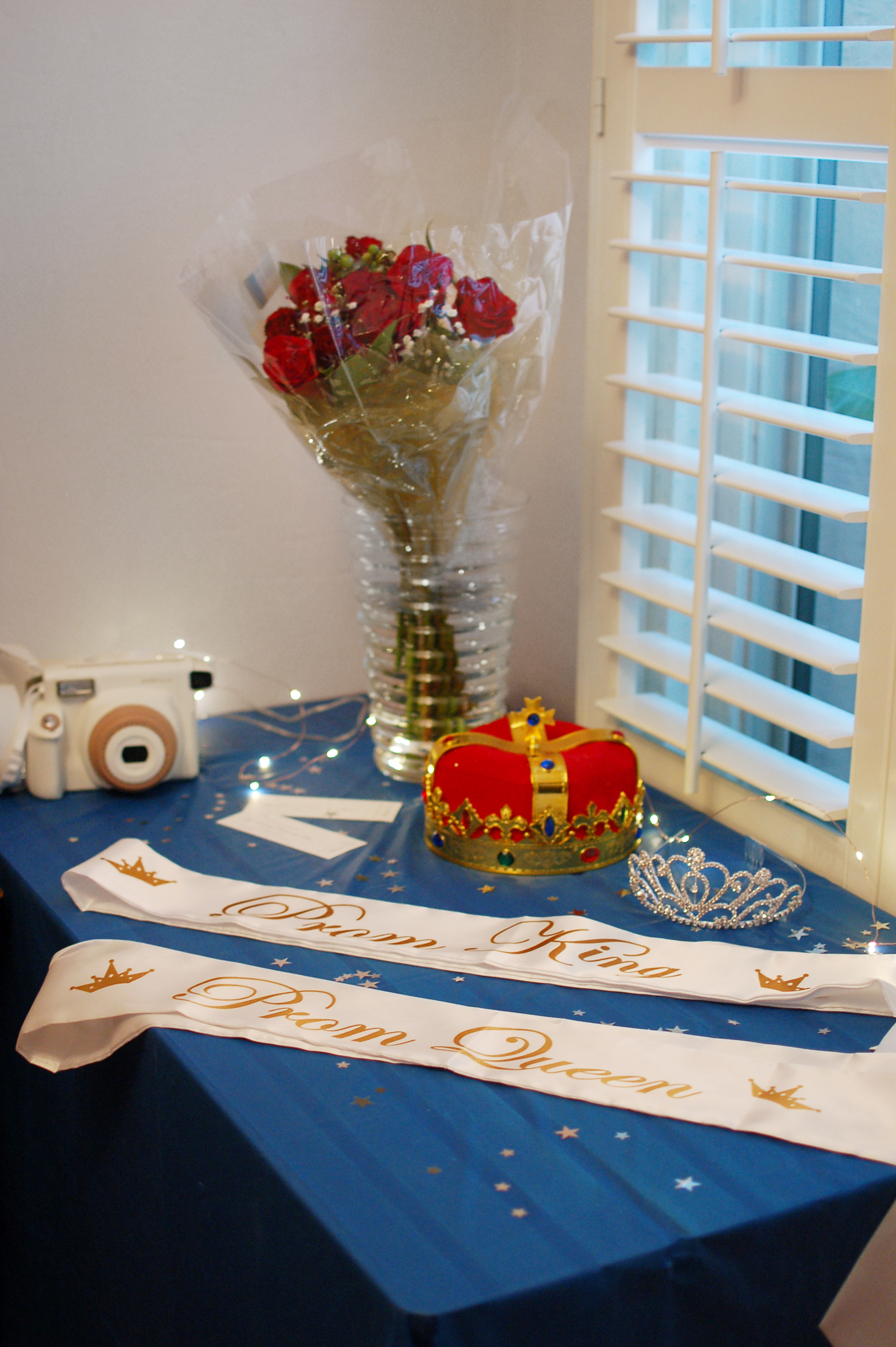 Photoshoot props: Prom King and Queen sashes, crowns, and a red rose bouquet.