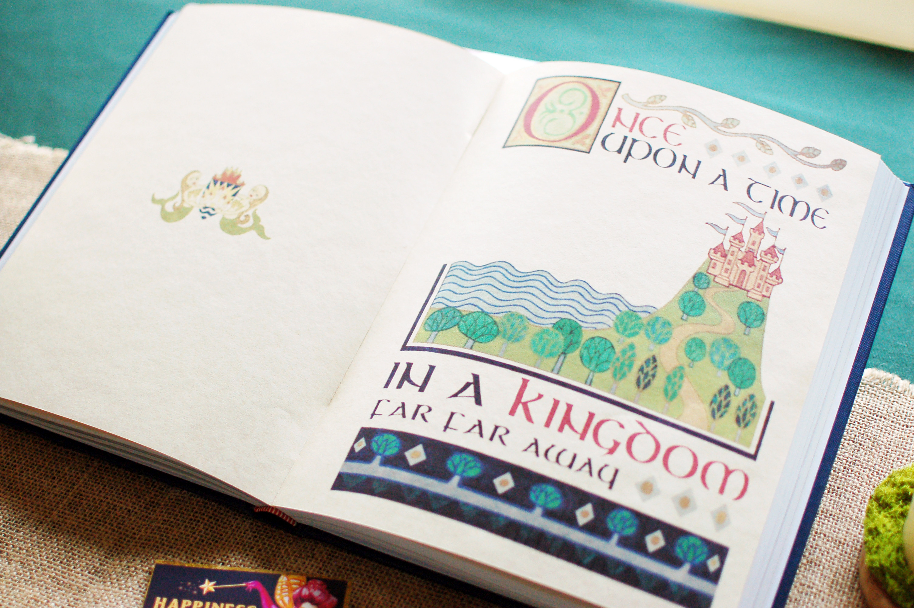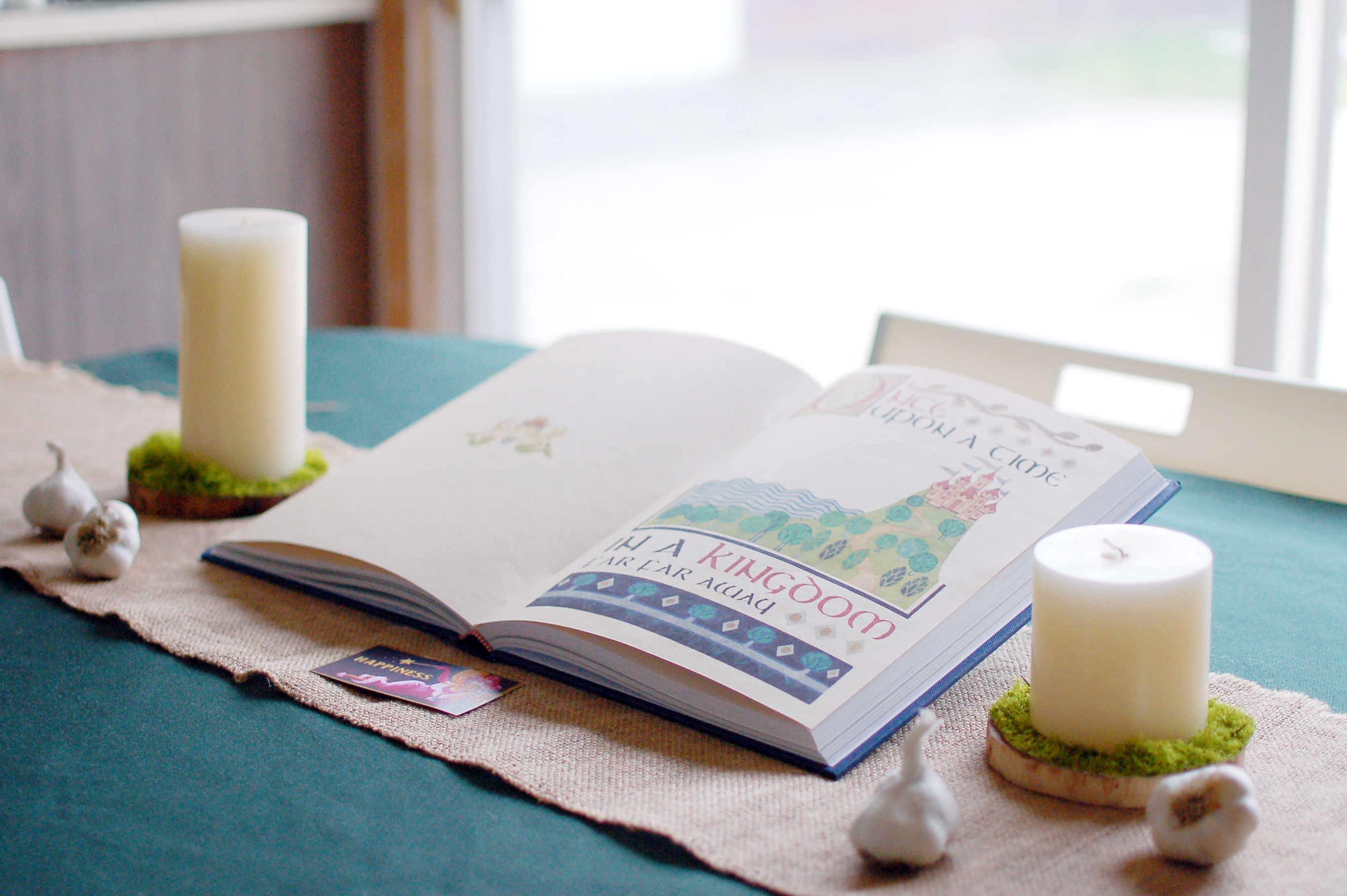 The Shrek movies, much like classic Disney princess movies, often begin with a classic storybook. Around the storybook, I had other Shrek-like props, including garlic, moss, and the Fairy Godmother’s business card.