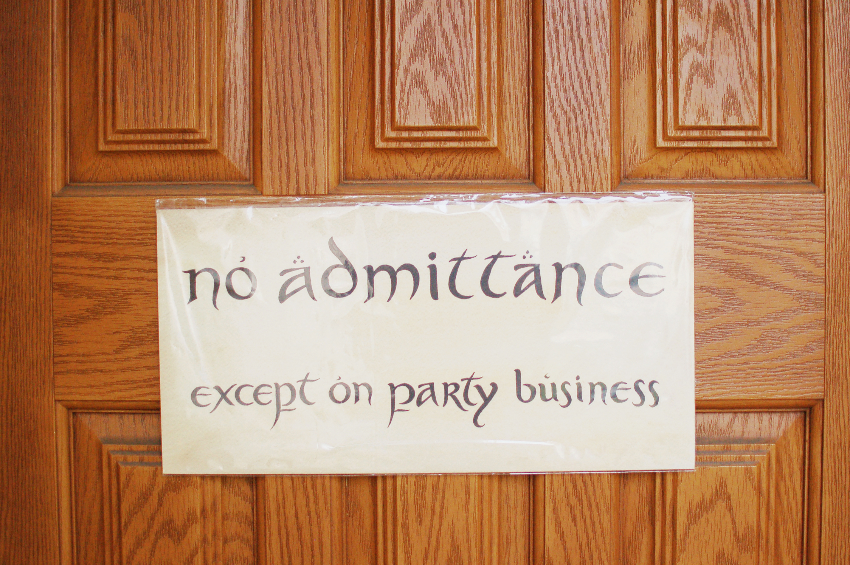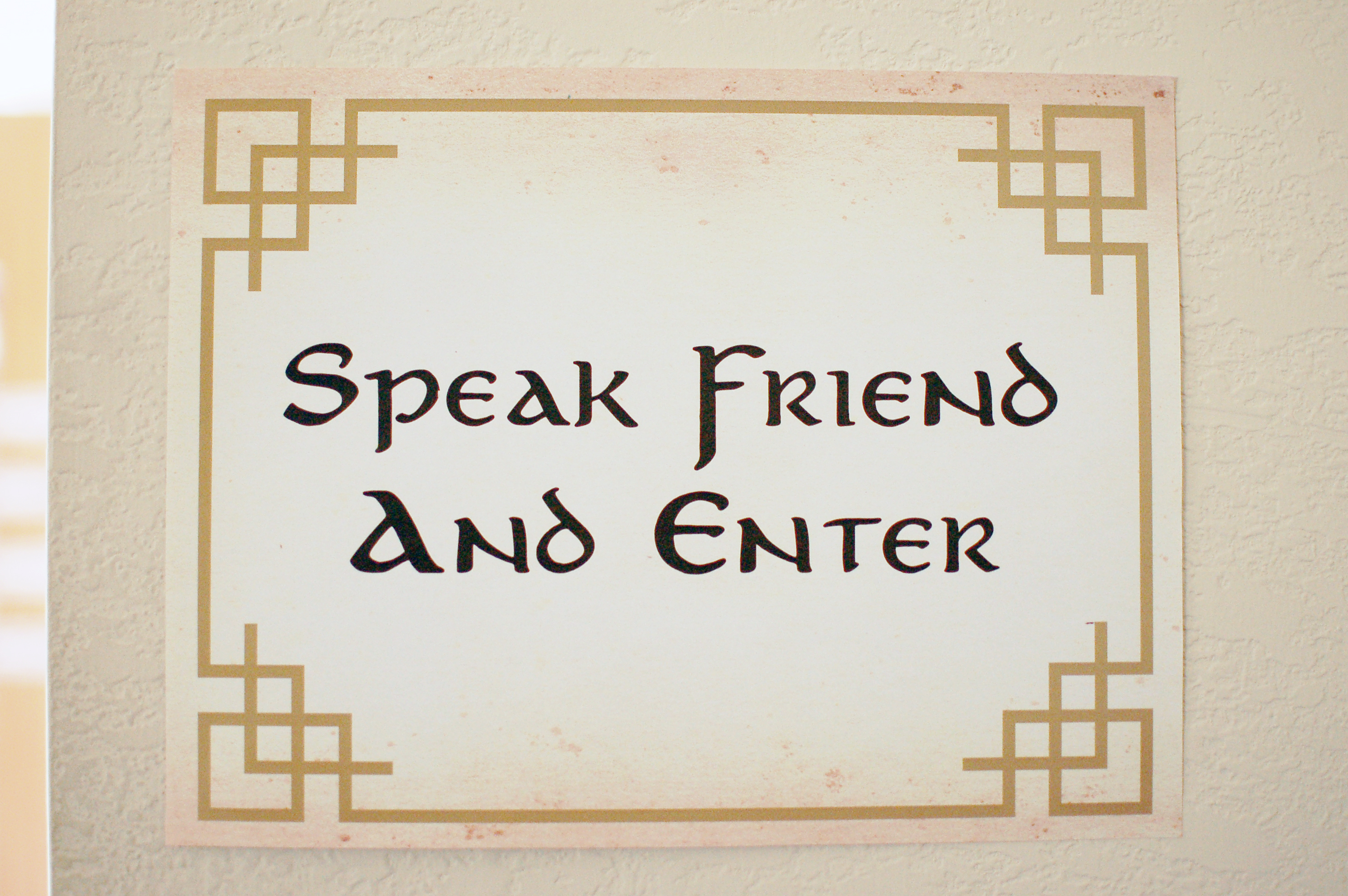If you know, you know. “Oh, it’s quite simple. If you are a friend, you speak the password and the doors will open.” I had this sign at the entryway to the party. I gave it a Lord of the Rings-style border, used the official typeface and the aged paper texture for the background.