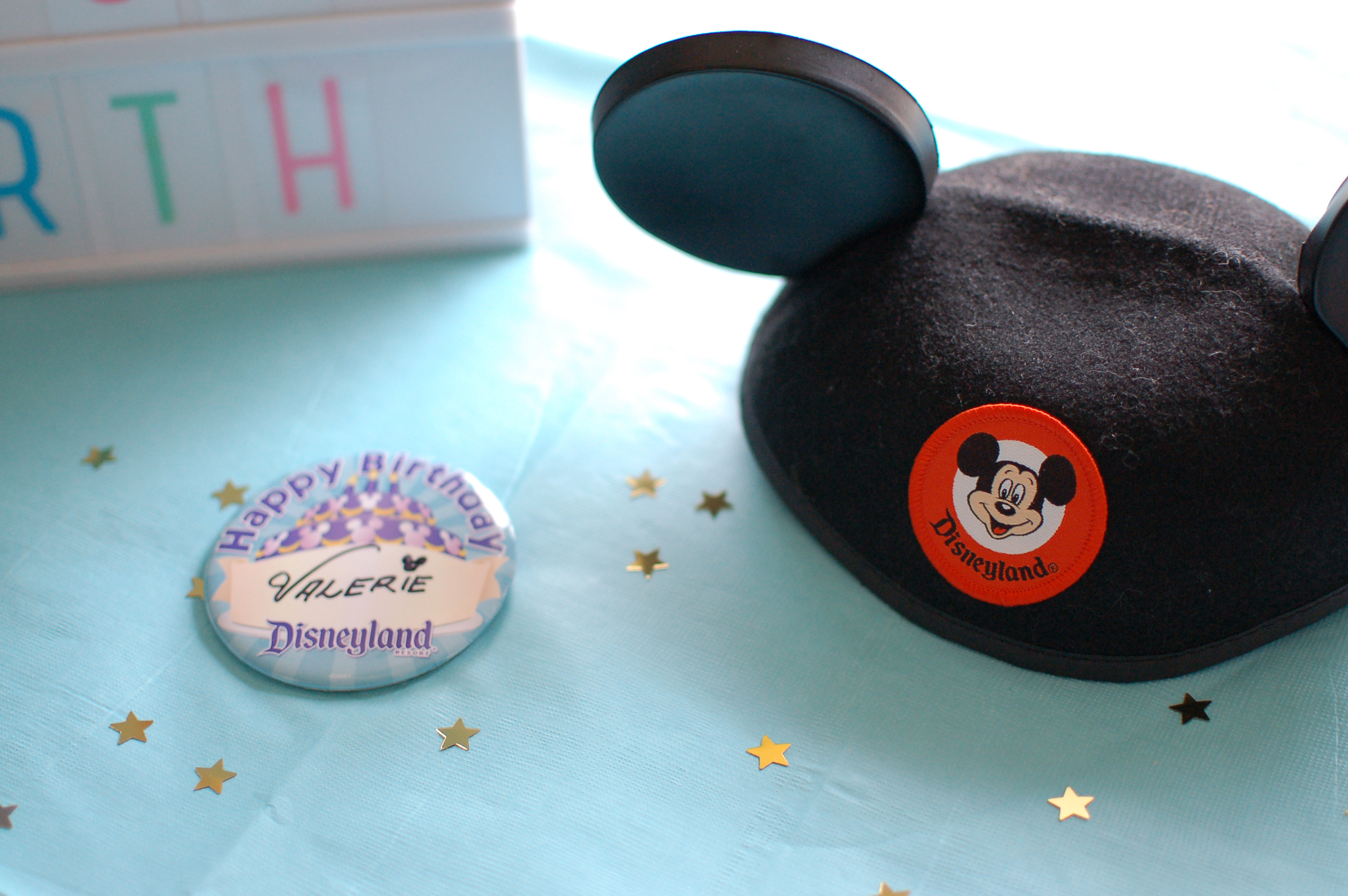 Since we were mid-pandemic, I ordered a blank “Happy Birthday” button online for an authentic Disneyland birthday experience and threw in my own classic Mickey ears hat.