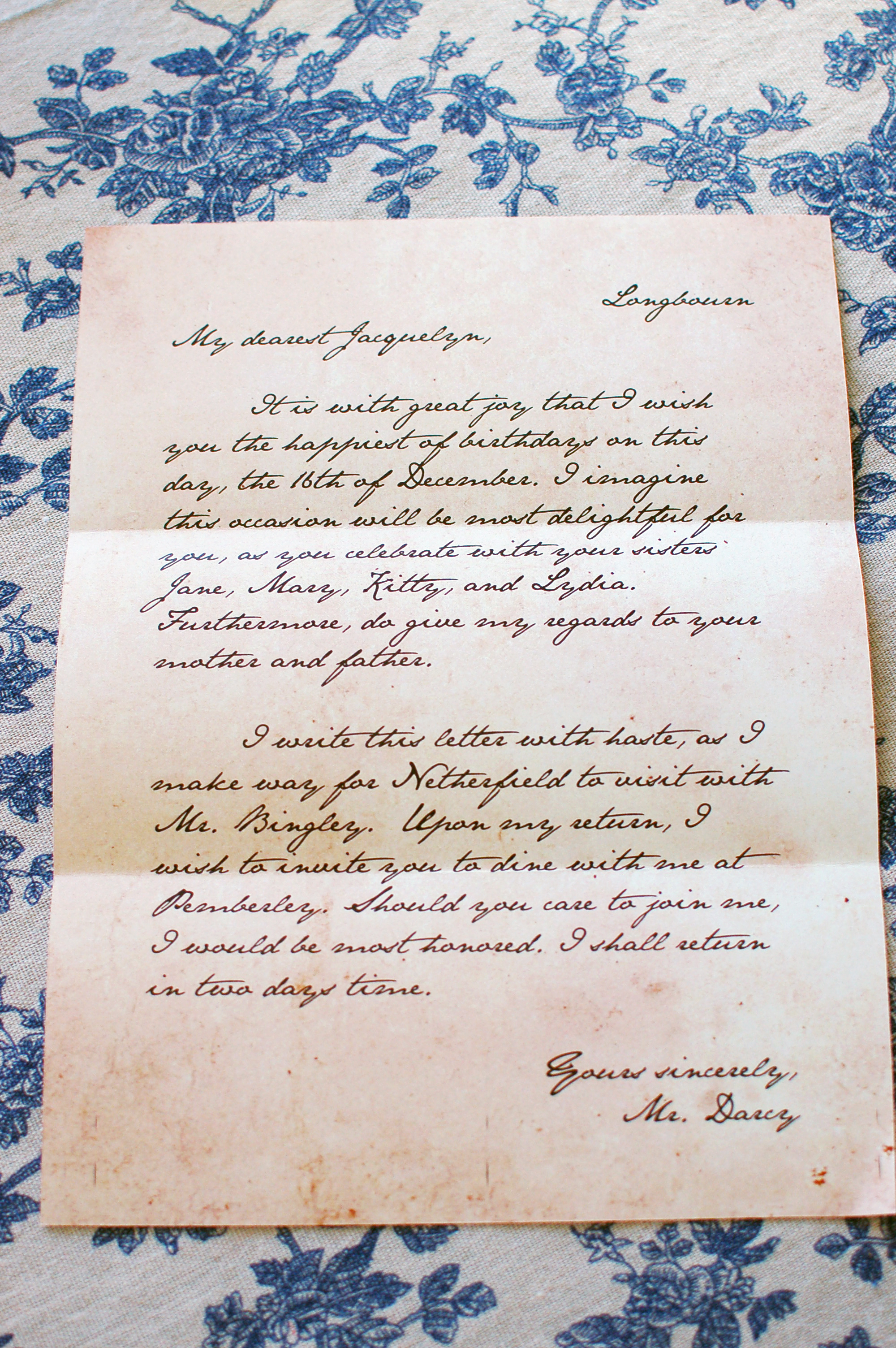 What better way to wake up on your birthday than to a handwritten letter from Mr. Darcy? I wrote this letter using a handwritten font that just so happened to be named “Jane Austen” and added an aged paper texture to the background.