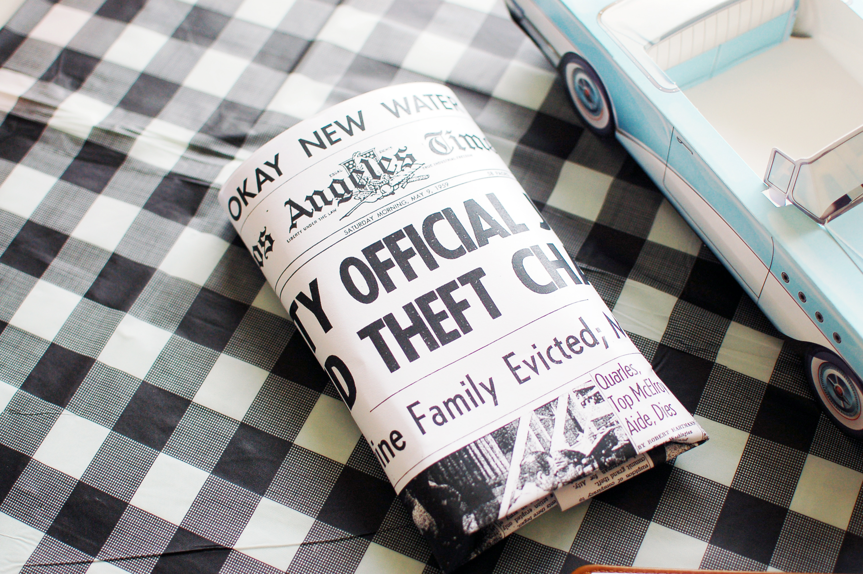 A classic vintage car serving tray that resembles Marion's car in the movie.