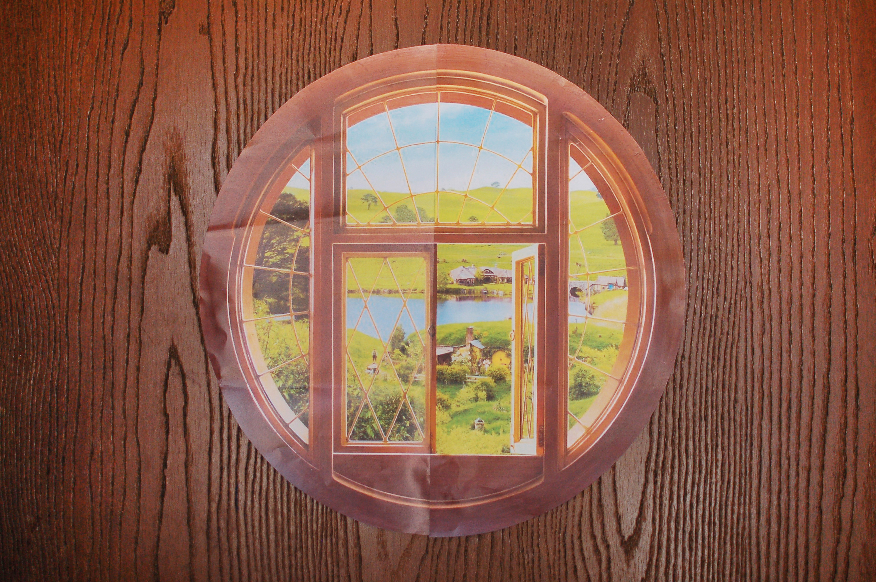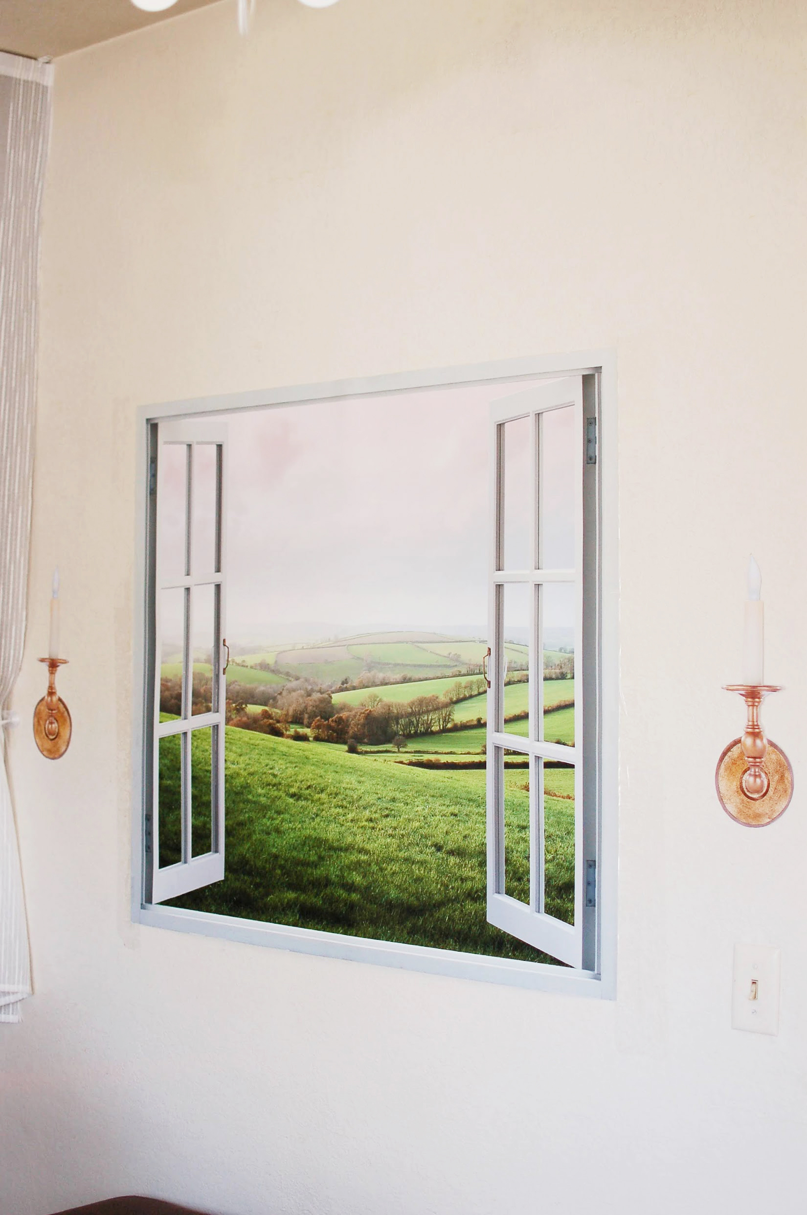 The open window overlooking the rolling English countryside is comprised of an isolated window layer and a separate layer of the English countryside landscape that was printed at poster size.