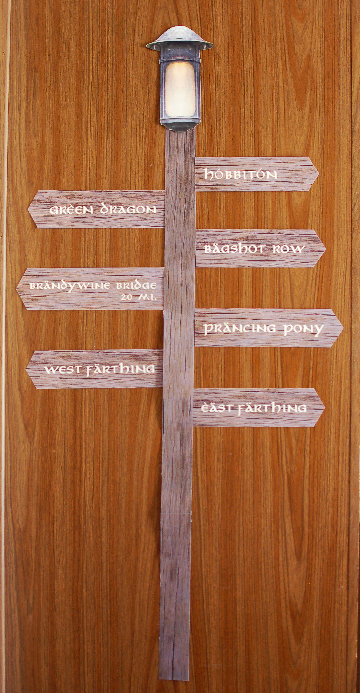 For the directional post, I matched the existing light posts in the film and put locations you’d find in and around The Shire.