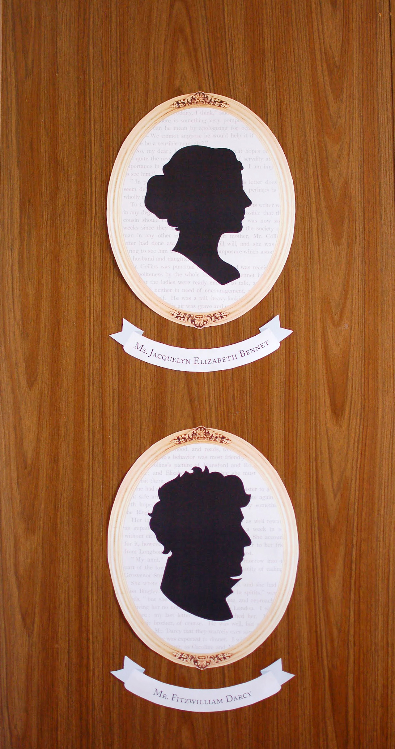 Various editions of the Pride & Prejudice book covers feature silhouette portraits. I made one silhouette portrait for the birthday girl and one for Mr. Darcy. I overlayed their portraits on top of scanned pages of the book itself and put an ornate gold frame on top. I designed a banner for each of their names, using an old-style serif for their names to match the text on the book pages.
