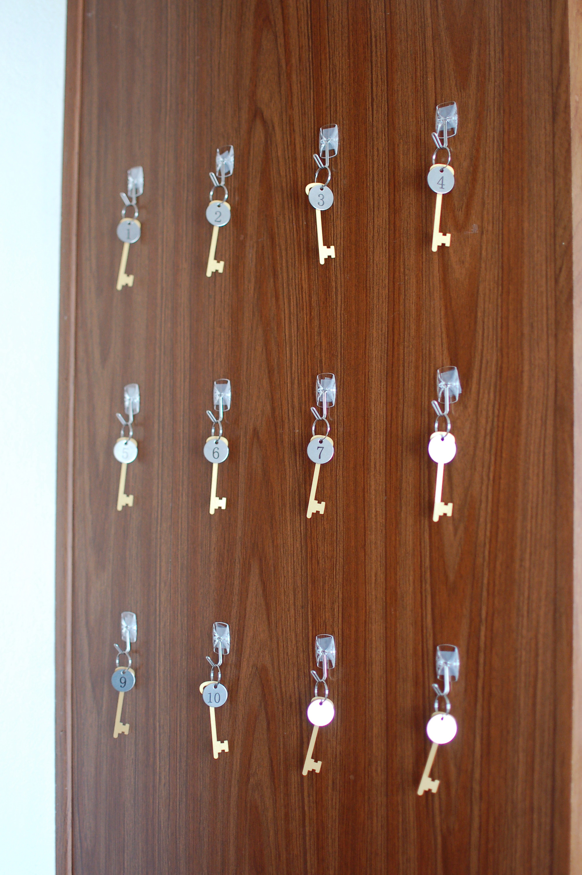 12 keys for 12 vacant rooms. I used command hooks to stick to the wall, ordered numbered key tags online, and used a Cricut to cut out gold paper keys that I slid onto the split key ring.