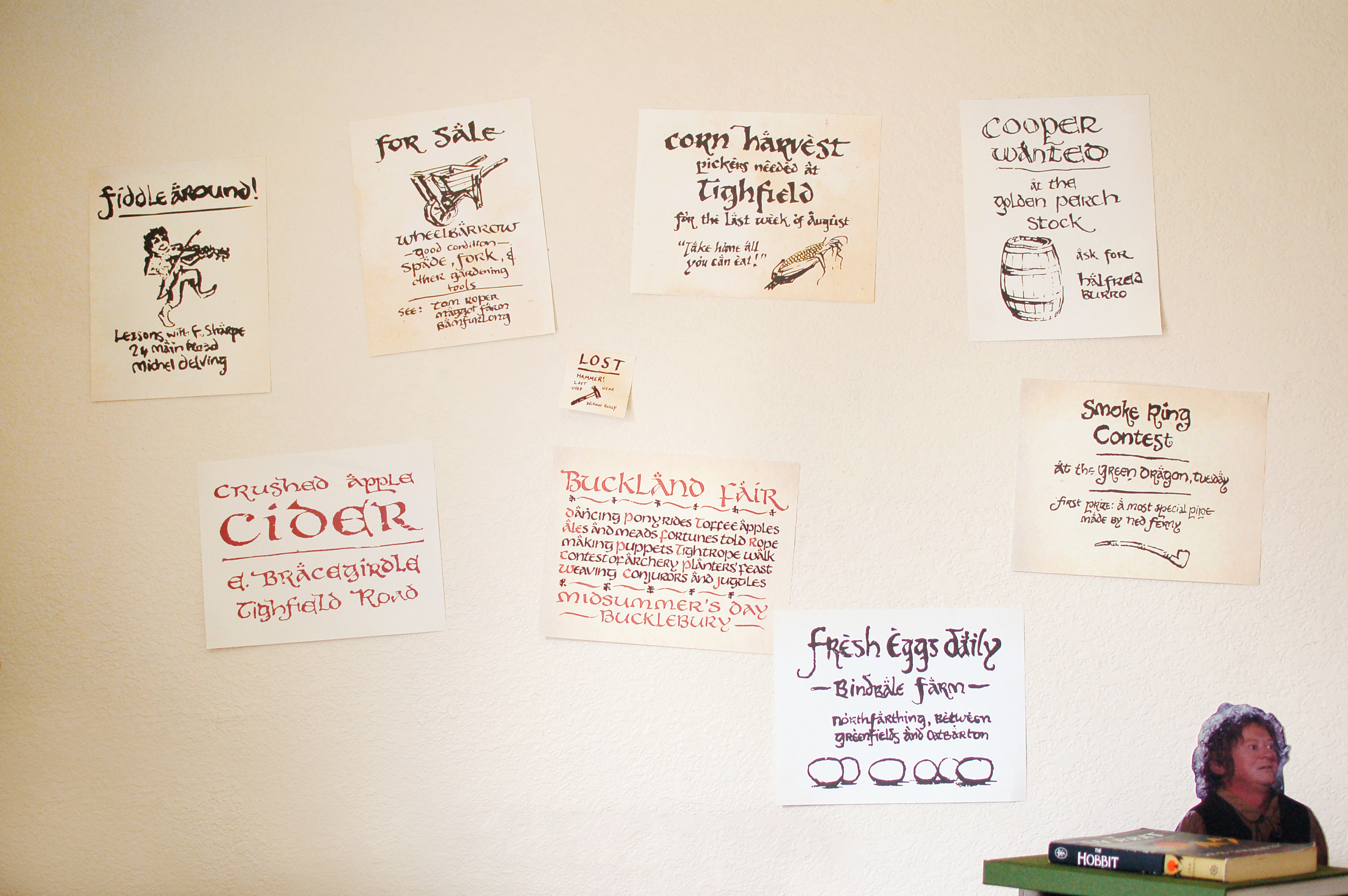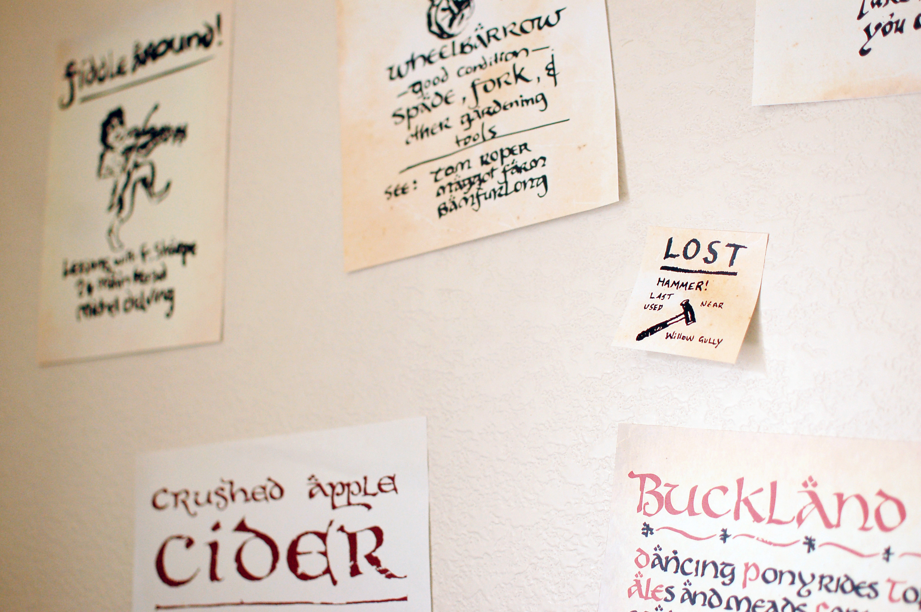 To no one’s surprise, I have visited the actual Hobbiton in New Zealand. I remember seeing a message board with many handwritten signs posted to it. I grabbed my photos of the Hobbiton message board, vectorized it, and printed it over various aged paper textures.