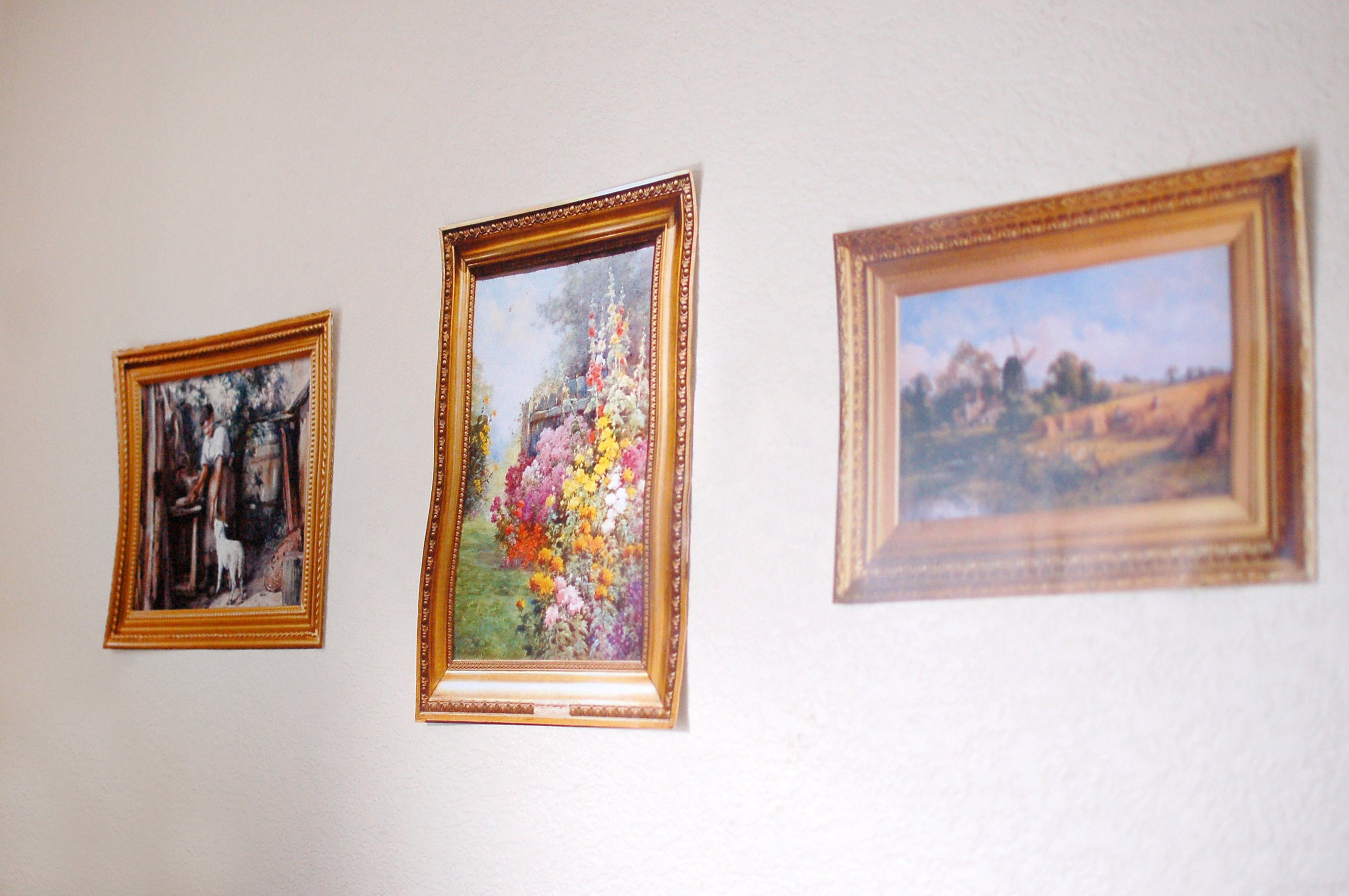 I found works of art from the 1800s that fit the time period and read “English countryside”. Then, I laid a gold frame on top to make them look like real oil paintings.
