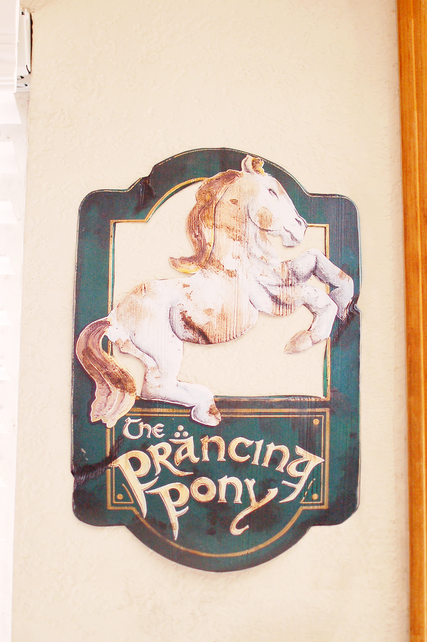 I found an image of an actual wooden sign of “The Prancing Pony” and printed/cut it out to put above the drinks station.