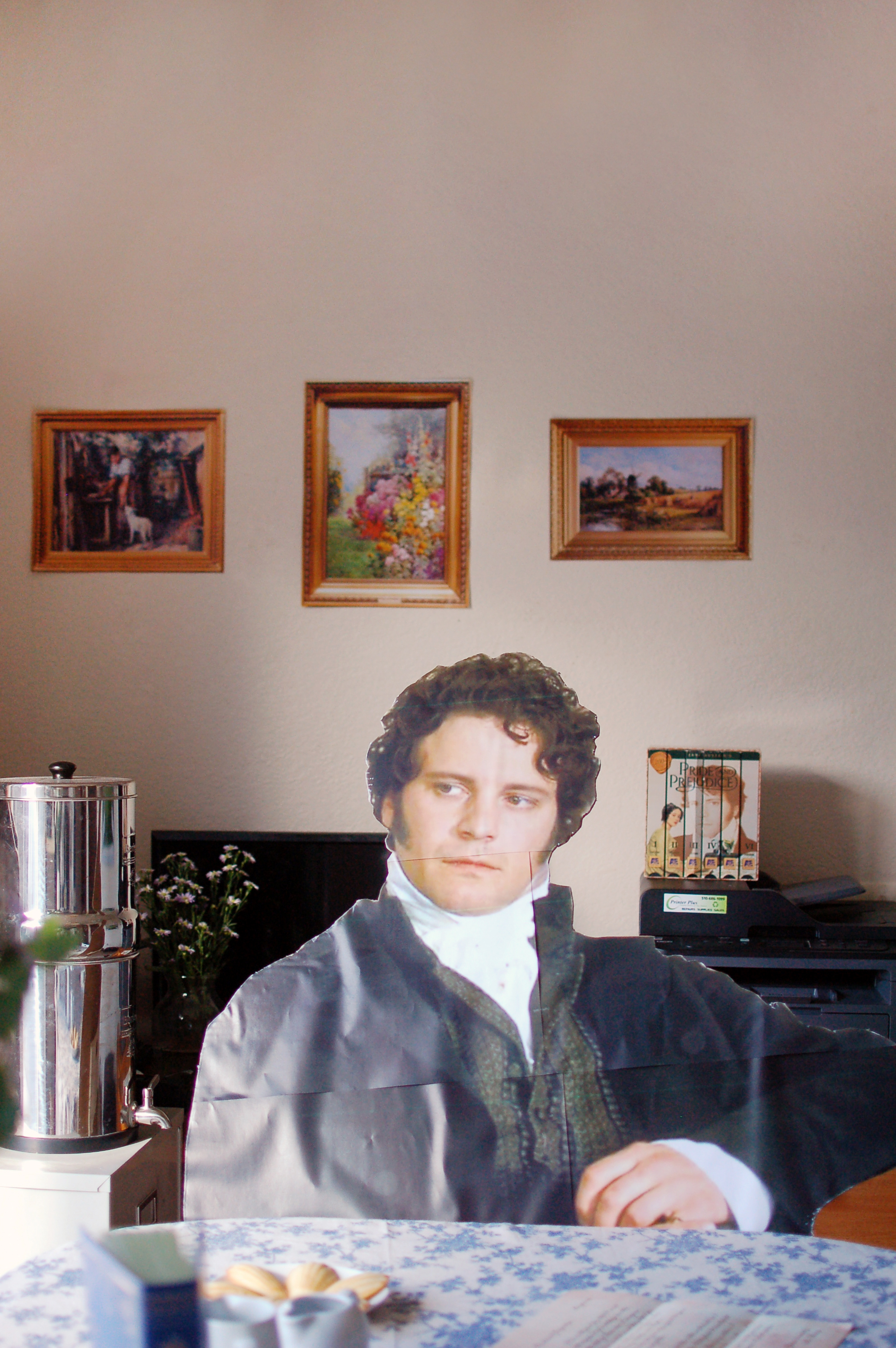 My sister made this life-size cardboard cut out of our special guest, Mr. Darcy, who joined us for some English breakfast and tea.